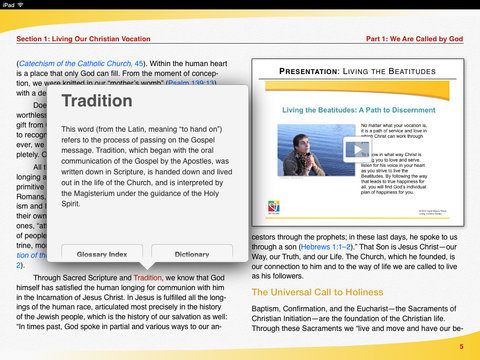 - In-text links to official, online versions of Scripture, the Catechism, and Church documents so that students can study quotes from the text in their original context.