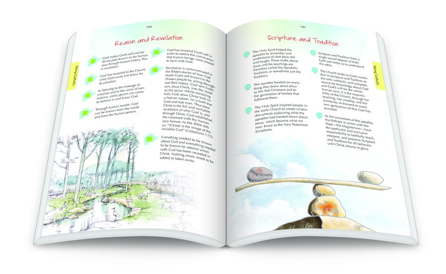 I am a big fan of the CYB. We use it as one of the texts for Confirmation preparation and also for the RCIA – gifting one to each seeker as they enter the process. Many conversations have been started by what they have read in the extra features; these articles have introduced Catholic culture and are a great guide for navigating daily life as a new Christian. I like the water color palette of the new 4th edition – it's subtle, and somehow it feels more ”sacred” than bolder primary colors. The art work is appealing and invites the reader to take that extra moment to reflect on the image. The doodle art option is appealing too – a great start to contemplative prayer. The navigation tool is truly helpful, giving practical assistance without making the reader feel like they are doing 'Scripture Reference for Dummies.'