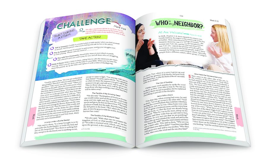 A big difference I notice in the 4th edition of The Catholic Youth Bible is the extensive footnotes. As a high school religion teacher, helping students understand the depth of scripture can be challenging. The footnotes create opportunities to take students deeper and help them see connections to other sections of the bible and other passages. The Catholic Connections feature stands out as a useful tool for class beyond scripture. They anchor specific Catholic teachings in sacred scripture. For example, “Stop the Cycle” (Genesis 4:15) would be an excellent resource for a Morality or Social Justice class.