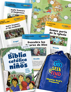 Everything you love about Go Seek Find, including Spanish Activity Booklets and La Biblia Católica para Niños!