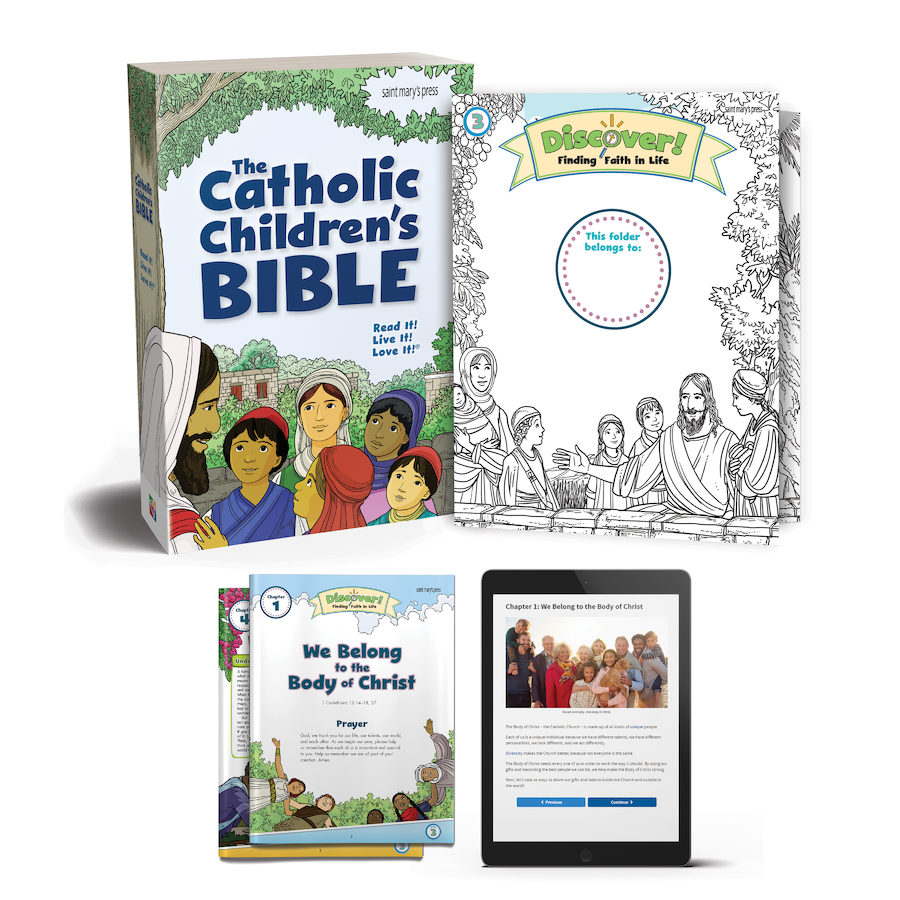 Each child receives their own Discover! Kit, containing everything they need for their exciting faith journey. Children will dive into Bible stories in their own Catholic Children's Bible to encounter Jesus through the stories and people of scripture. Then, they get out of their seats for a built-in energetic learning activity that helps build a meaningful lesson. Next, they connect the Bible story and hand-on activity with Catholic doctrine through age-appropriate prayers, puzzles, and challenges in their Activity Book. Watch as they connect the dots and transform a learned faith into a joyfully lived faith!