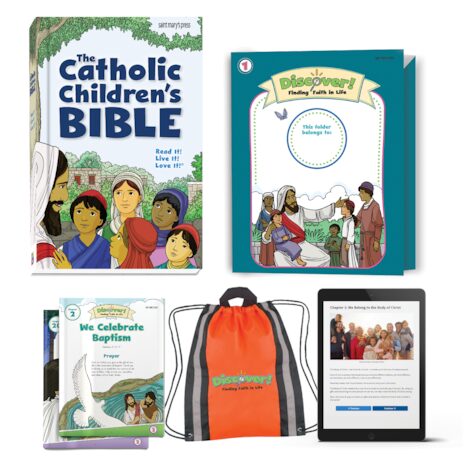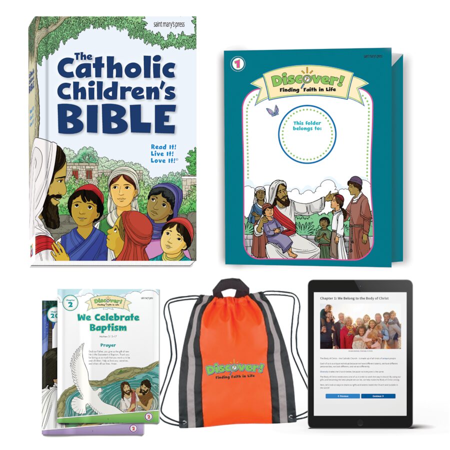 Each child receives their own Discover! Kit, containing everything they need for their exciting faith journey. Children will dive into Bible stories in their own Catholic Children's Bible to encounter Jesus through the stories and people of scripture. Then, they get out of their seats for a built-in energetic learning activity that helps build a meaningful lesson. Next, they connect the Bible story and hand-on activity with Catholic doctrine through age-appropriate prayers, puzzles, and challenges in their Activity Book. Watch as they connect the dots and transform a learned faith into a joyfully lived faith!