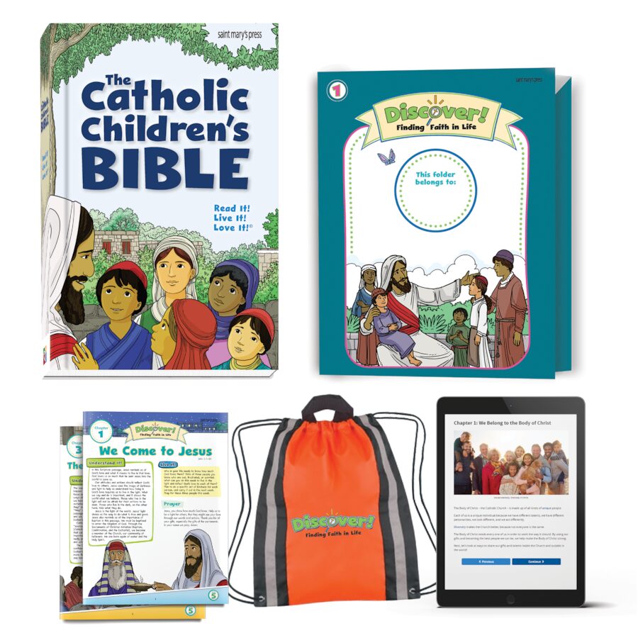 Each child receives their own Discover! Kit, containing everything they need for their exciting faith journey. Children will dive into Bible stories in their own Catholic Children's Bible to encounter Jesus through the stories and people of scripture. Then, they get out of their seats for a built-in energetic learning activity that helps build a meaningful lesson. Next, they connect the Bible story and hand-on activity with Catholic doctrine through age-appropriate prayers, puzzles, and challenges in their Activity Book. Watch as they connect the dots and transform a learned faith into a joyfully lived faith!