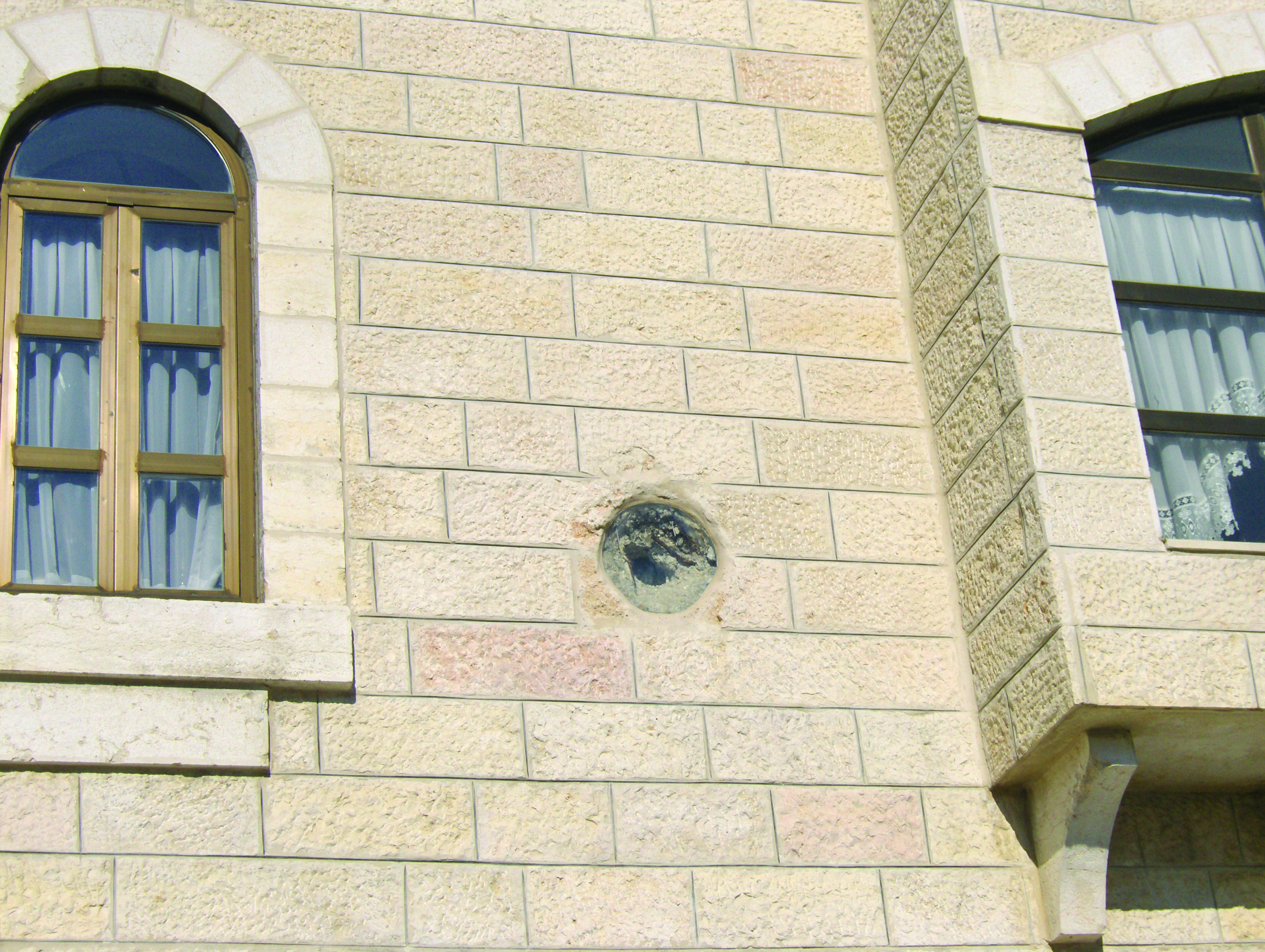 This is a photograph of a wall with an imprint caused from being hit by mortar during a past conflict between Palestinians and Israelis. The school has chosen not to fix it as a reminder of the conflict.
