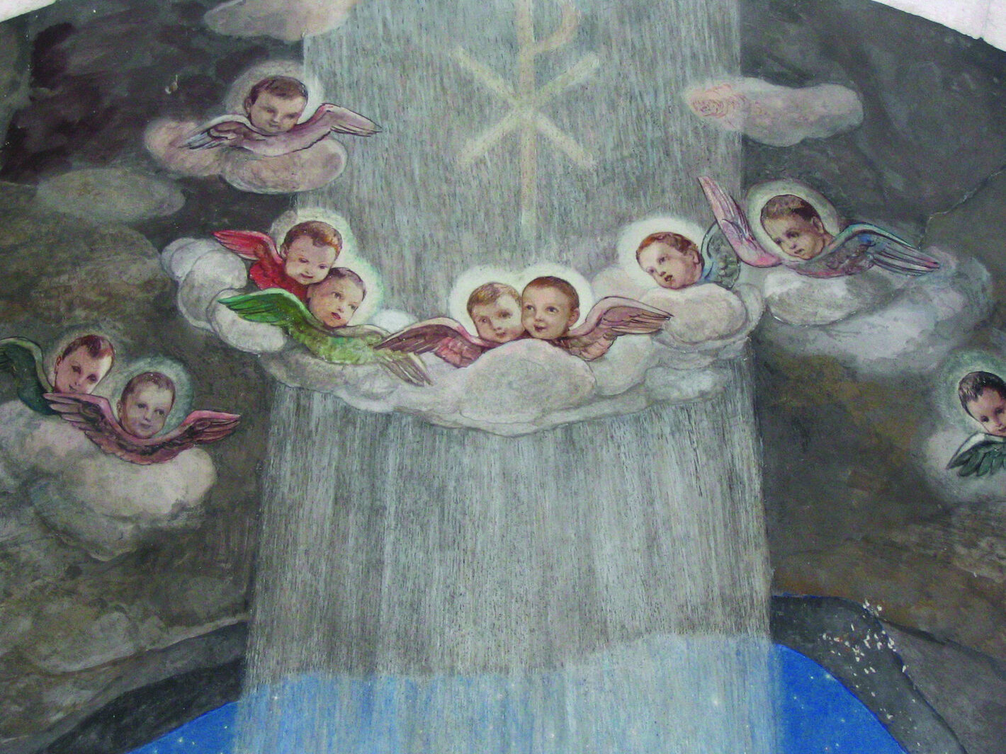 This is close up of the cherubim in a painting of the Nativity. It is inside the Church of the Shepherds in Bethlehem, Israel. It is the location that the angels appeared to the shepherds to lead them to the birthplace of Jesus.