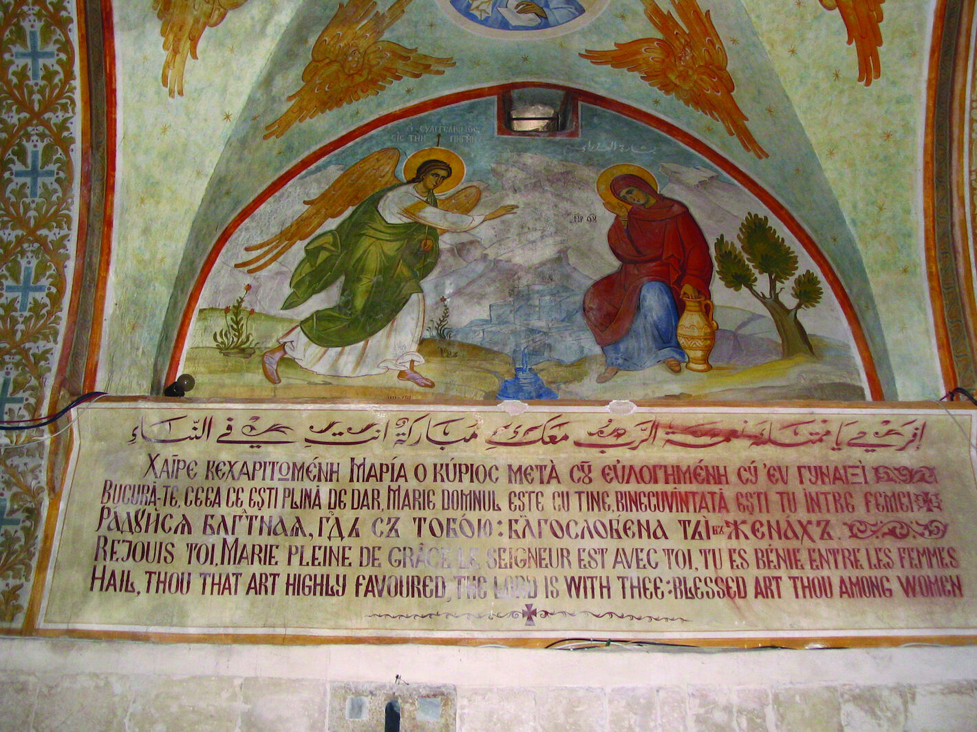 This is an icon from an Orthodox Church in Jerusalem. It depicts the Angel Gabriel coming to Mary to announce to the birth of Jesus.