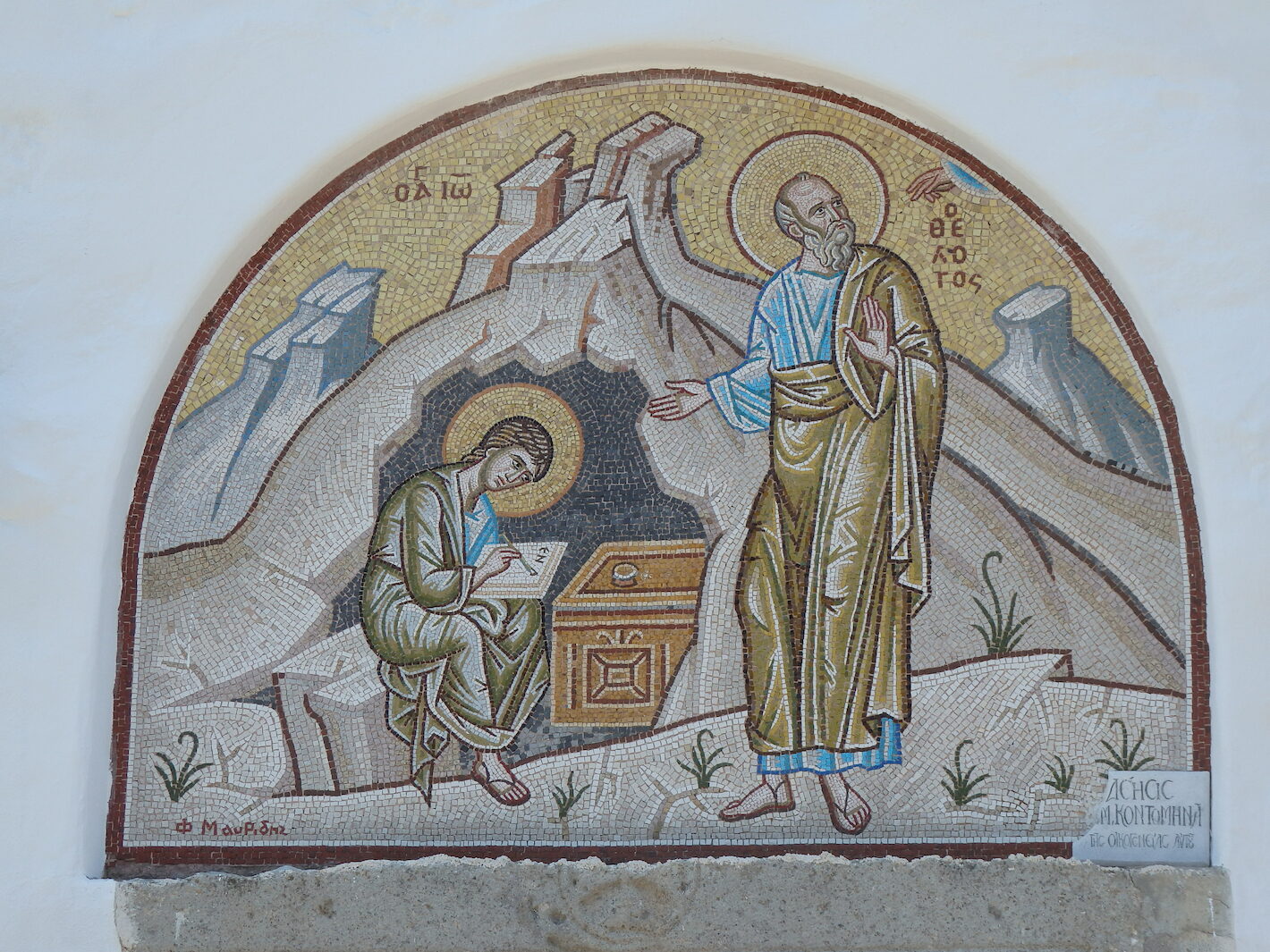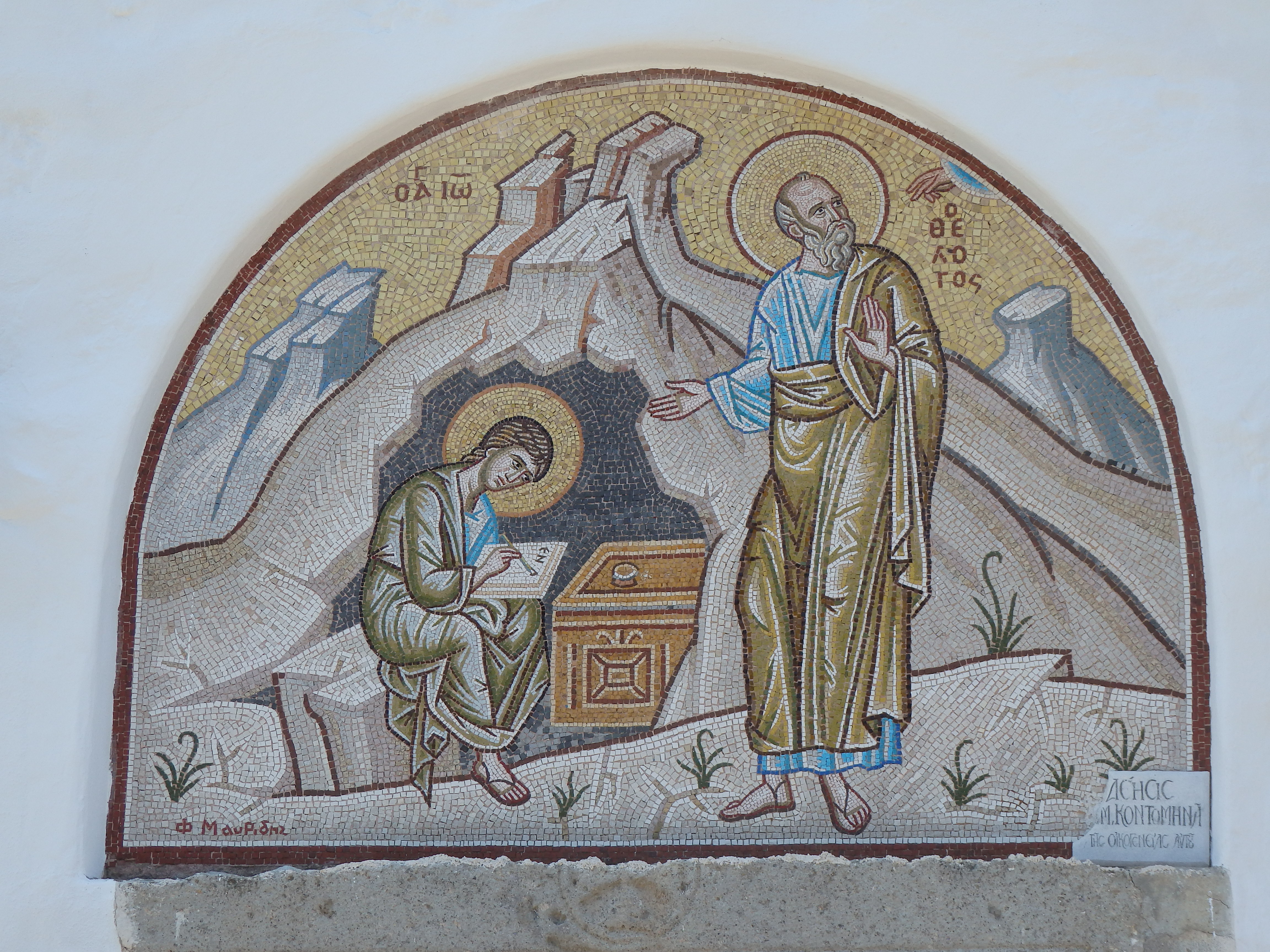 On the island of Patmos there is a cave that is venerated as the place where John had his visions. These visions led to the writing of the Book of Revelations. No photos are allowed in the cave so here is a picture of the fresco that shows Saint John dictating his visions to his disciple, Prochorus (another Greek Orthodox tradition). May we all have Saint John's faith in the glorious triumph of Christ over evil and the restoration of creation's full union with God once again.