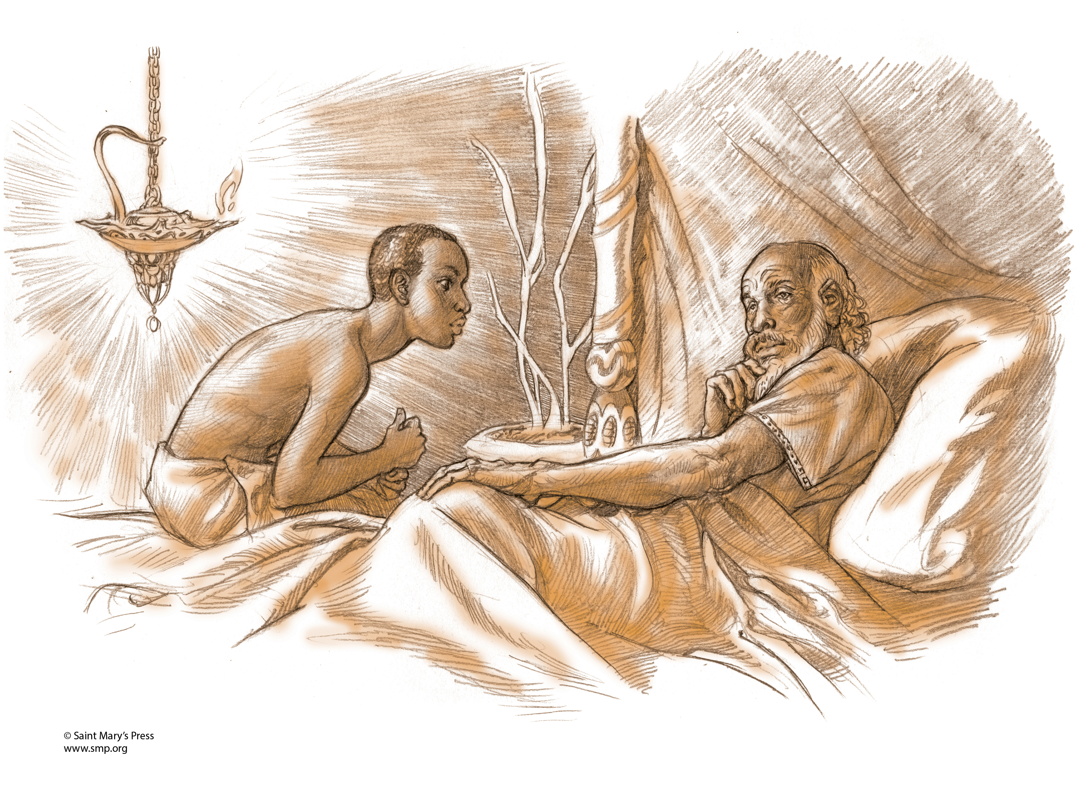 An illustration from The African American Catholic Youth Bible® of 1 Samuel 3:9 – God calls Samuel.