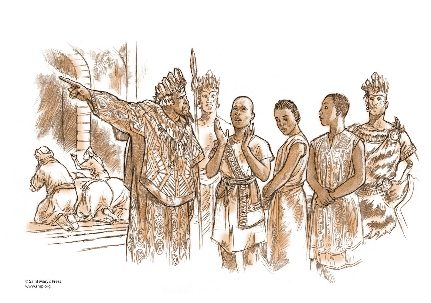 An illustration from The African American Catholic Youth Bible® of Daniel 3:14-15 – the fiery furnace.