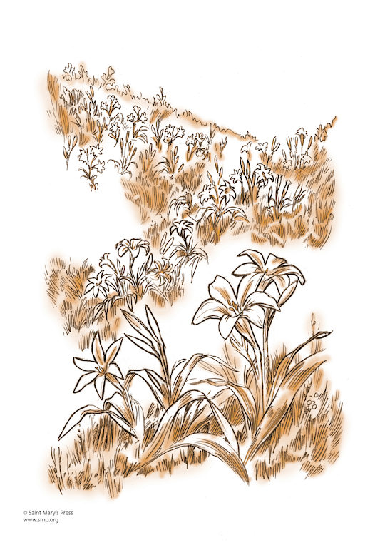 An illustration from The African American Catholic Youth Bible® of Matthew 6:28 – dependence on God; learn from the way the wild flowers grow.