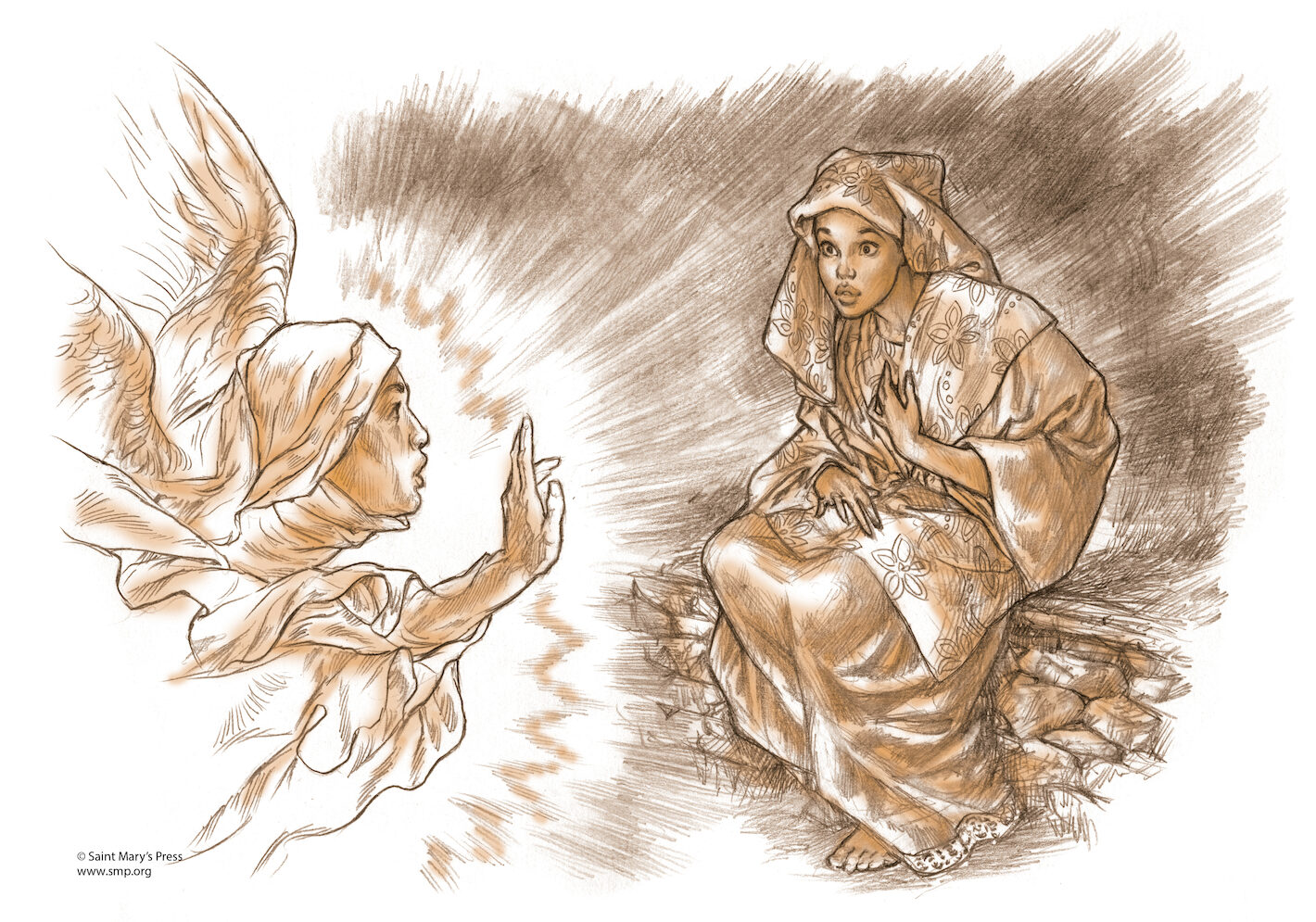 An illustration from The African American Catholic Youth Bible® of Luke 1:26-38 – the announcement of the Birth of Jesus.