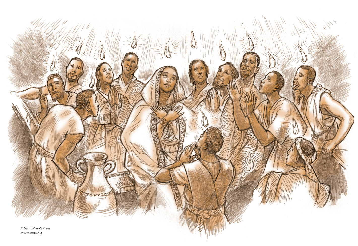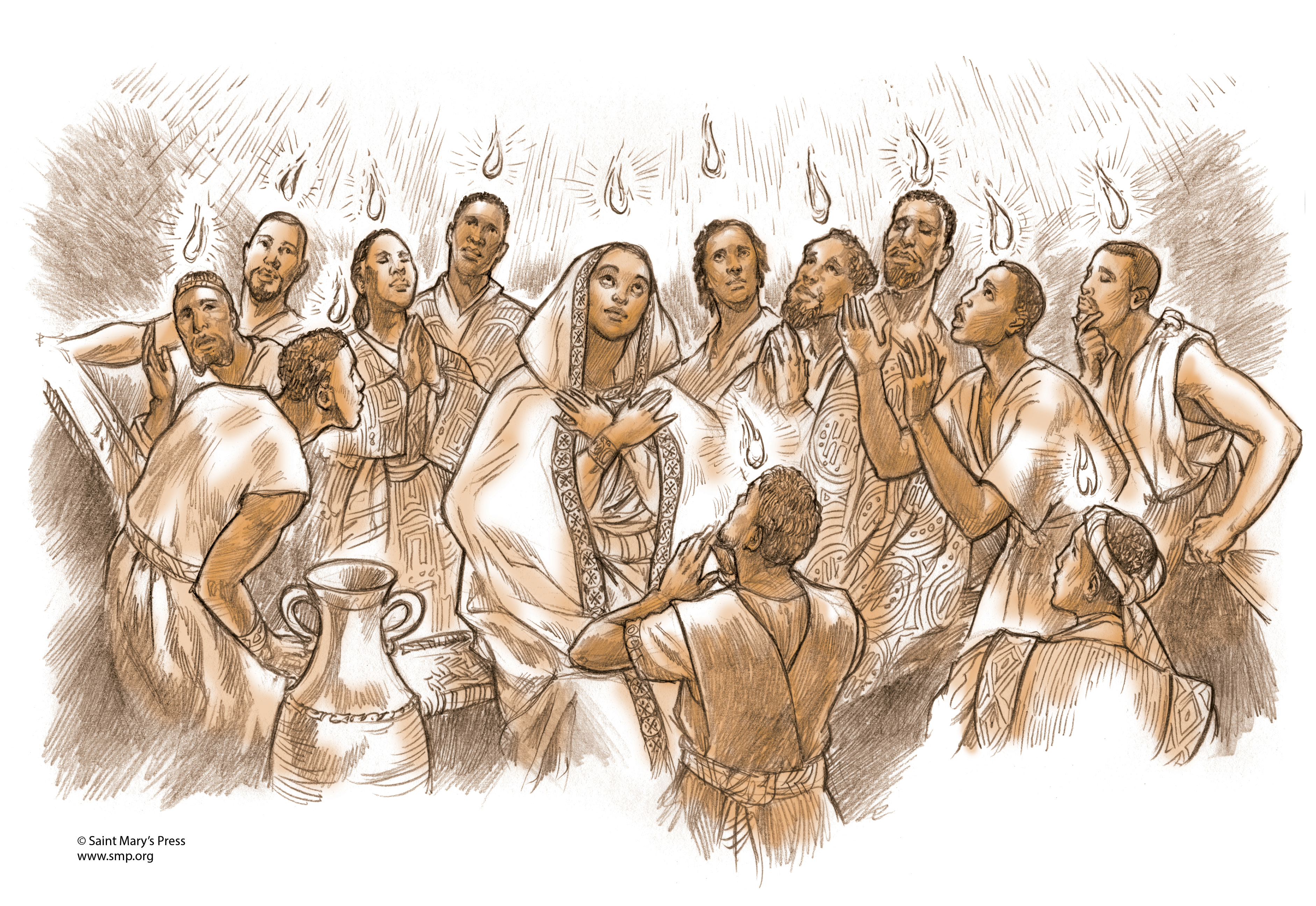 An illustration from The African American Catholic Youth Bible® of Acts 2:1-4 – the coming of the Spirit.