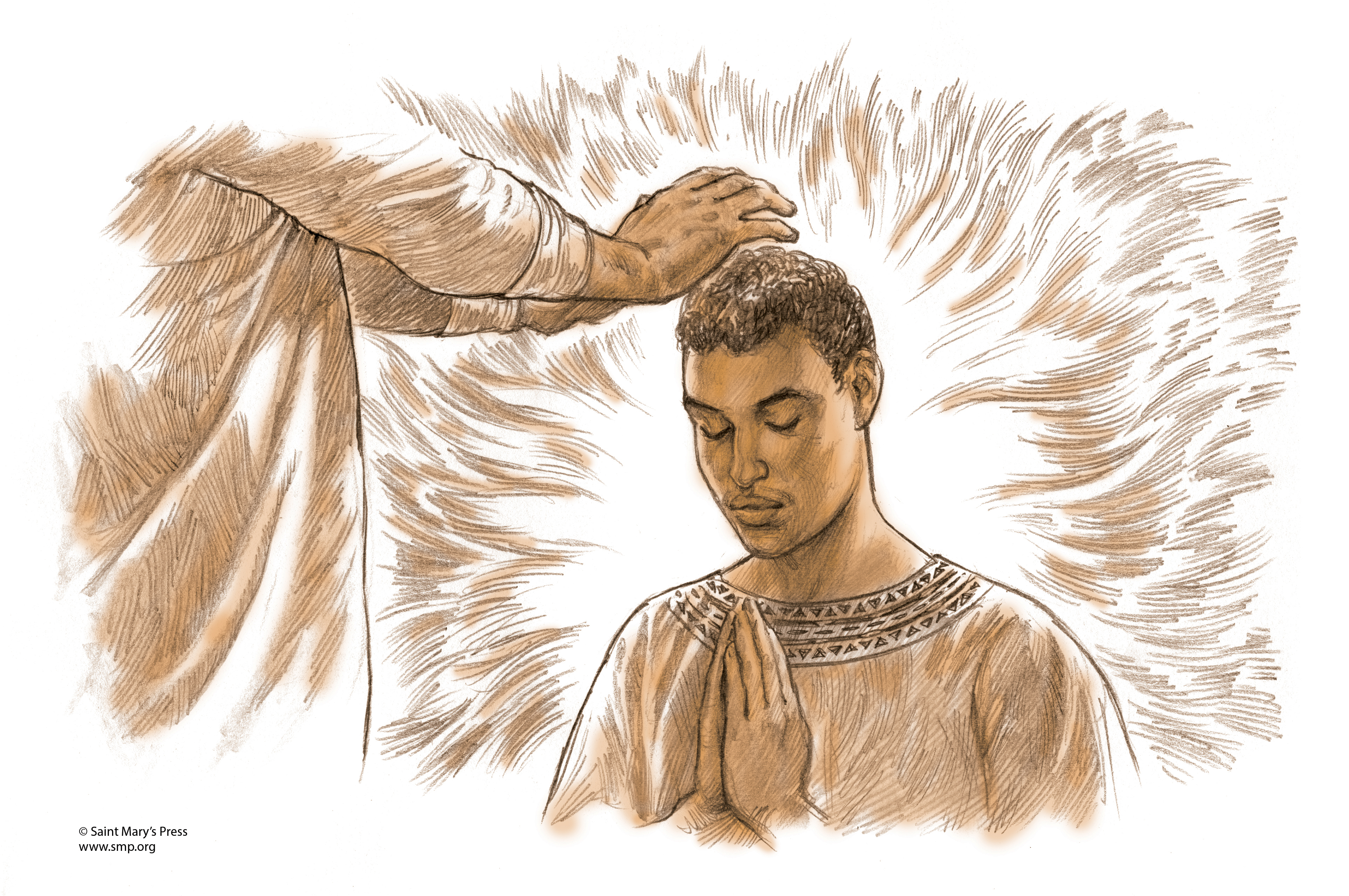 An illustration from The African American Catholic Youth Bible® of 2 Timothy 1:1-7 – laying on of hands.