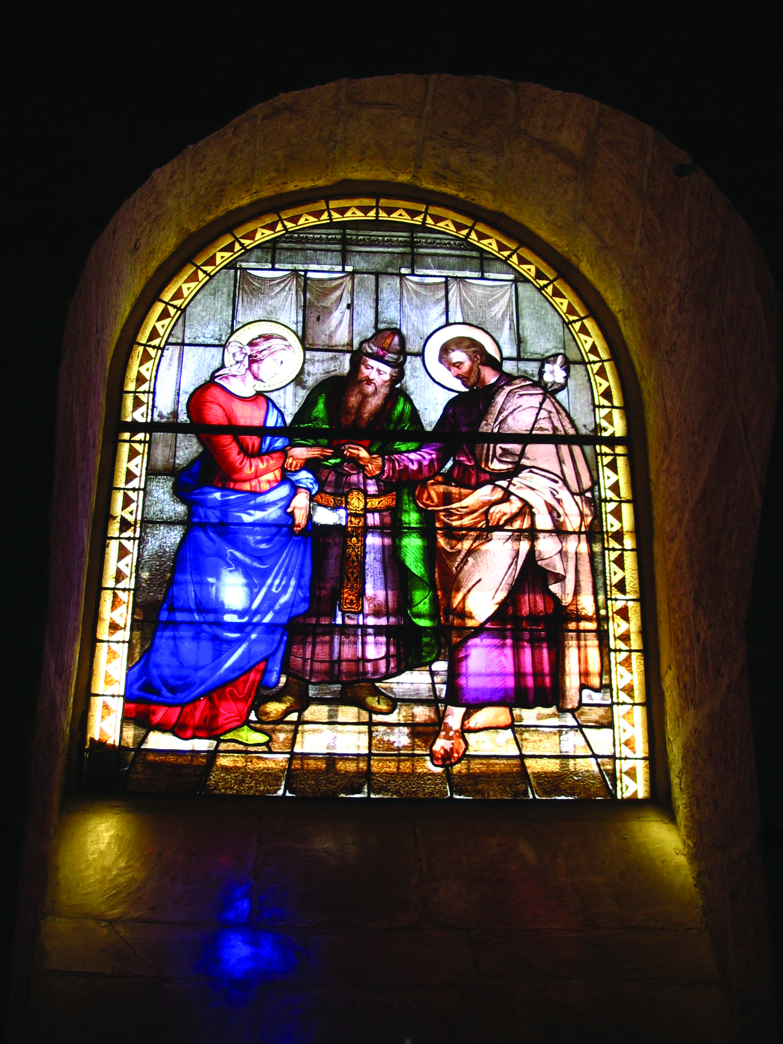 A depiction of Mary's betrothal to Joseph, as mentioned in Luke 1:26-27. According to tradition, St Joseph Church is located above St Joseph's carpentry workshop, as well as the home of the Holy Family.