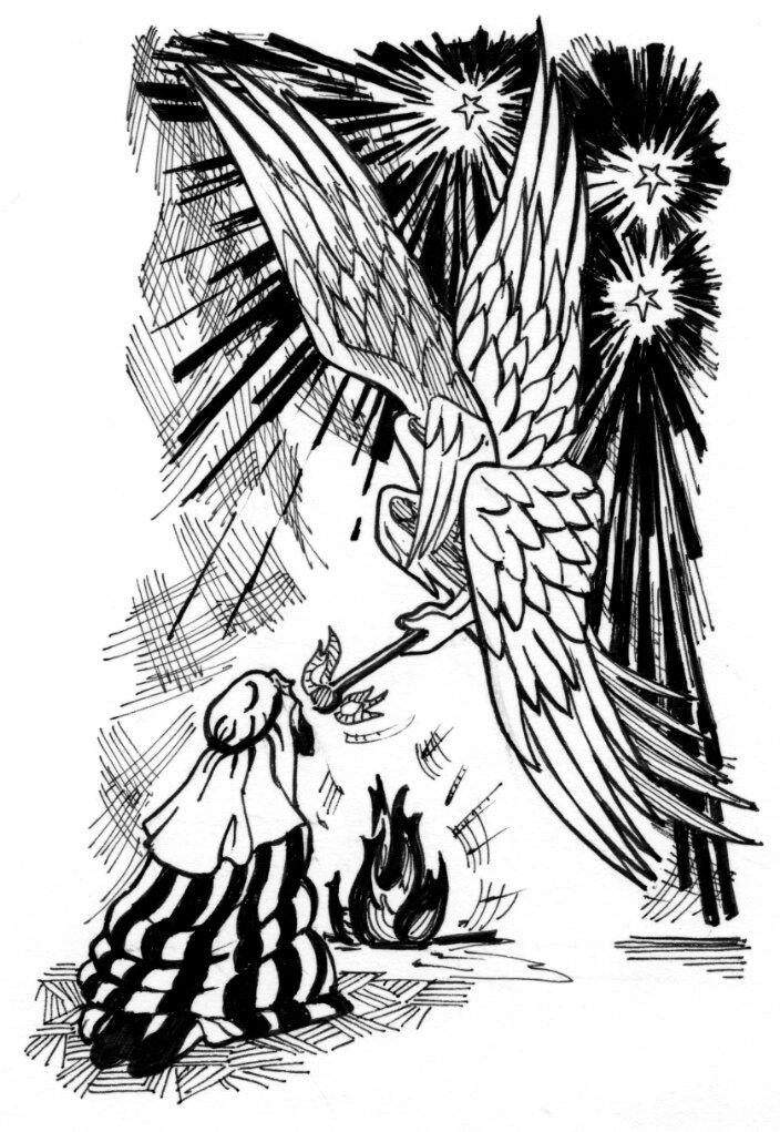 This is an illustration from the Book of Isaiah, when Isaiah is purified by the seraphim.