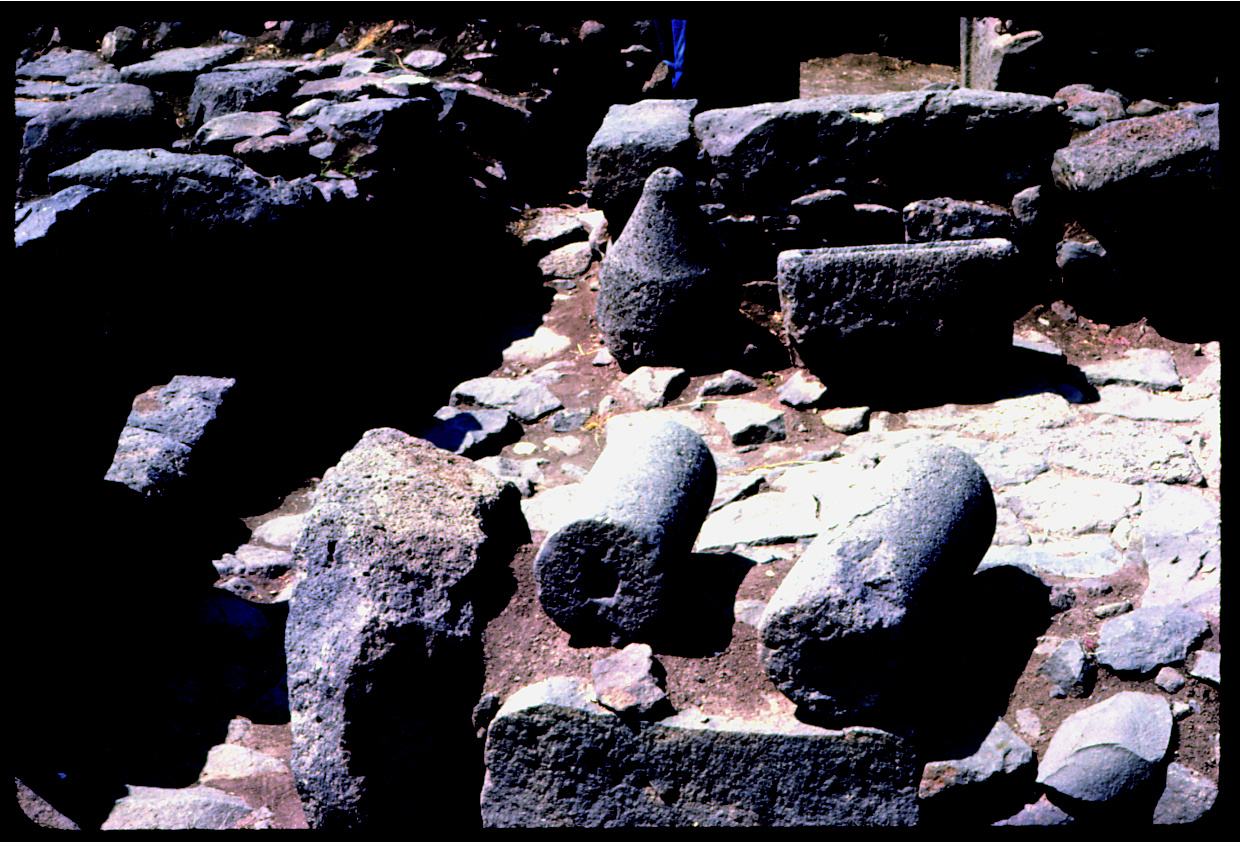 "This excavation site shows the remains of a first-century home. The cone-shaped rock was used to grind wheat into flour. The cylinders in the foreground were rolled over the mud roof to press out excess water."
