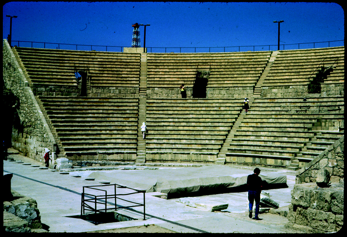 "This ancient ampitheater at Caesarea was built by Herod the Great and had a seating capacity of 3,500. Caesarea was the center of Roman government in Palestine for over 600 years."