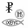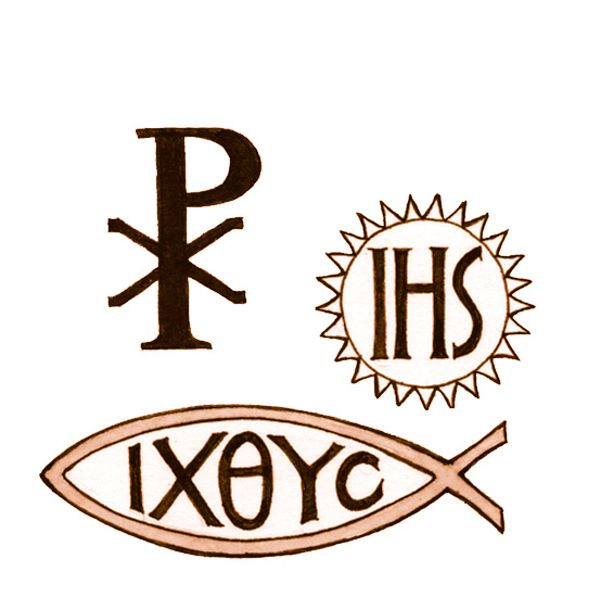 This image is an illustration of three very popular symbols of Christianity: the Chi-Rho, IHS, and the Fish. See http://fisheaters.com/symbols.html for more information on each symbol.