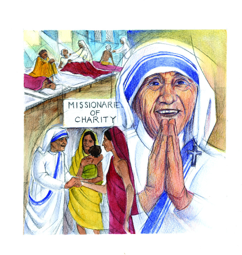This is an illustration of Saint Teresa of Calcutta in her work as the foundress of the Missionaries of Charity.