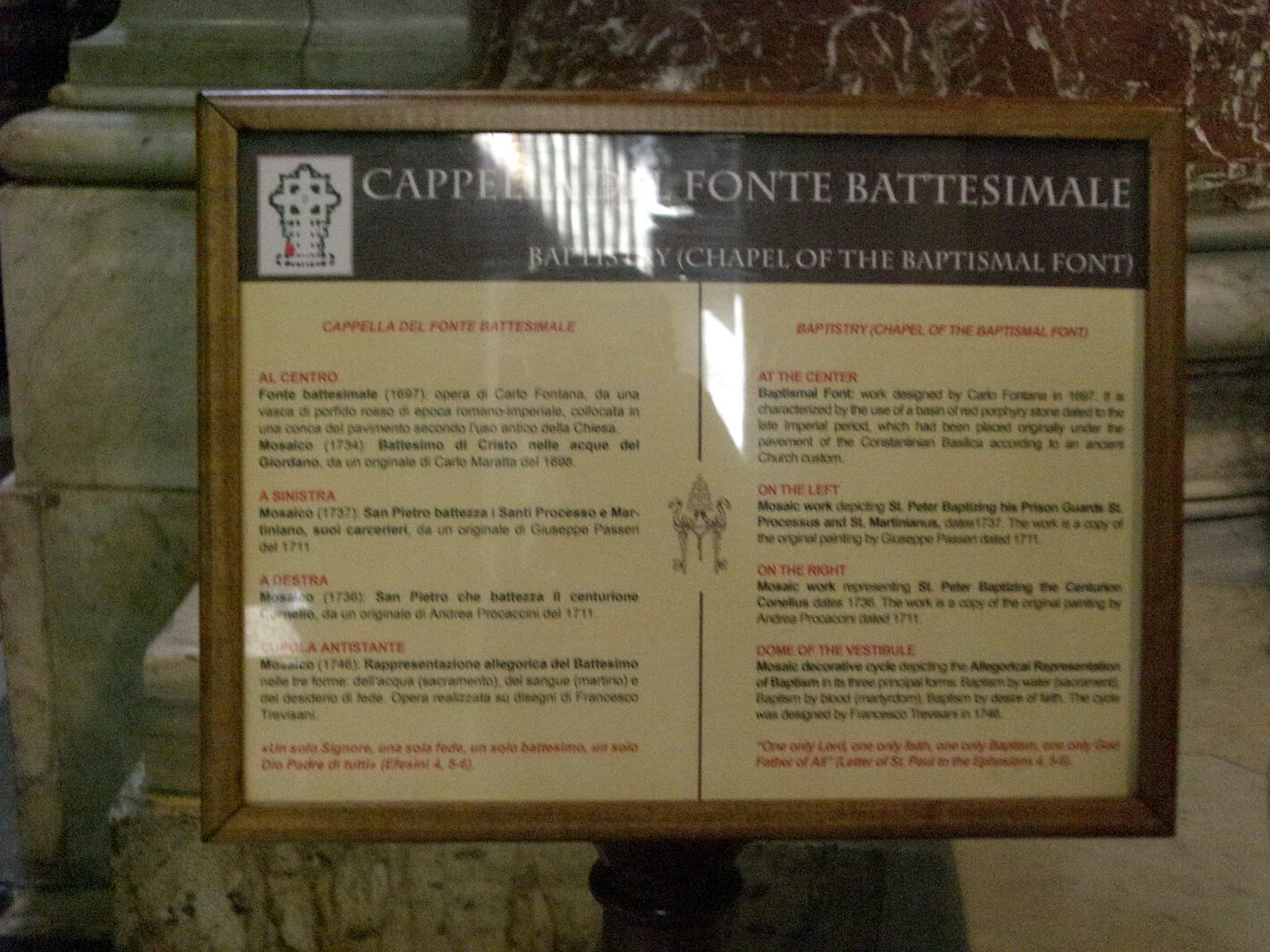 This is one of 4 ancient basilicas located in Vatican City and it has the largest church interior in the world. The altar in this Papal Basilica is built directly over the tomb of Saint Peter. This is a photo with information about the Chapel of the Baptistry.