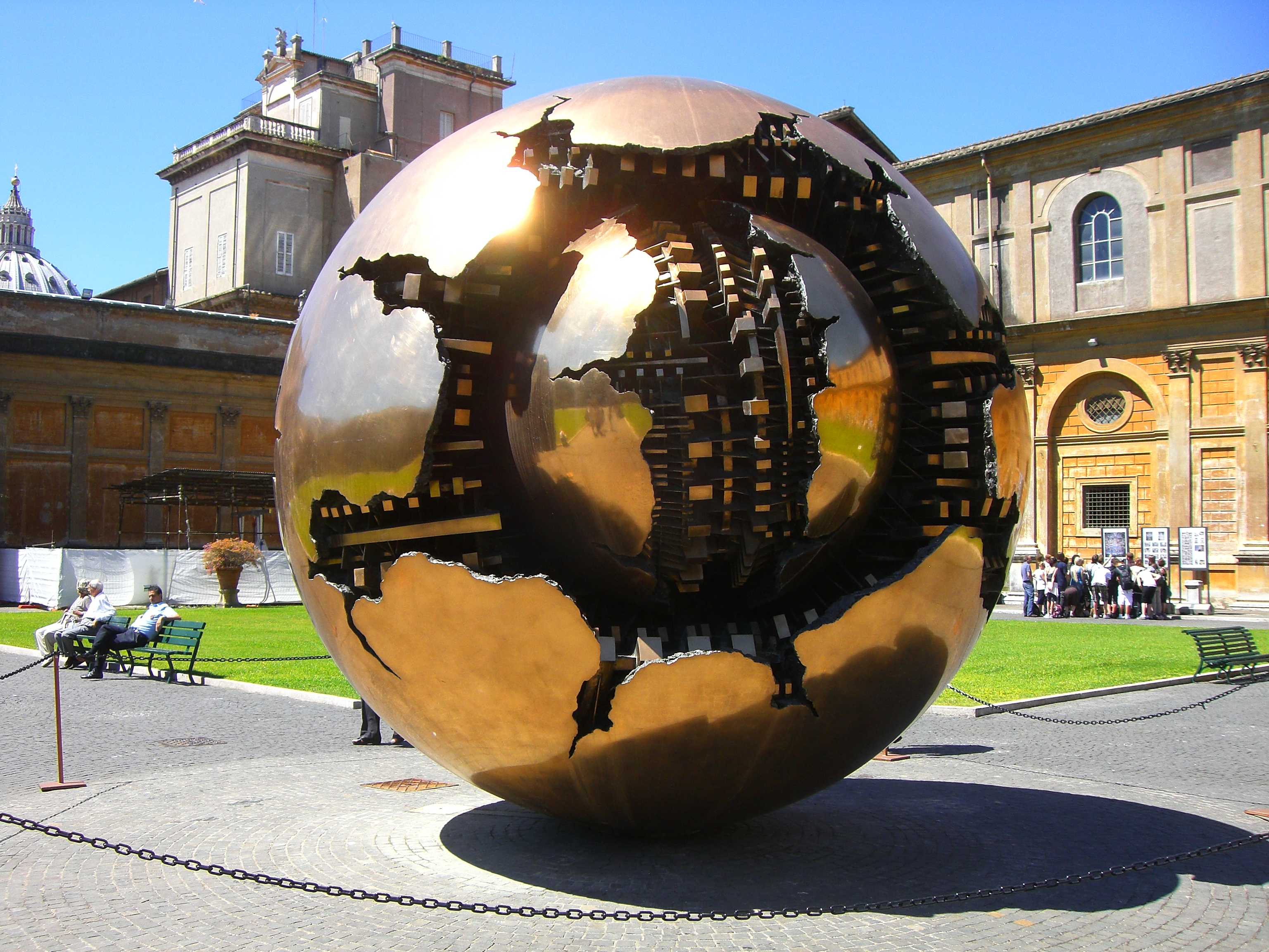 The Cortile del Belvedere, or Belvedere Court, located outside the Vatican Palace. The Cortile della Pigna (Court of the Pinecone) was added in later centuries. This is an image of the 'Sphere Within Sphere' in the courtyard.