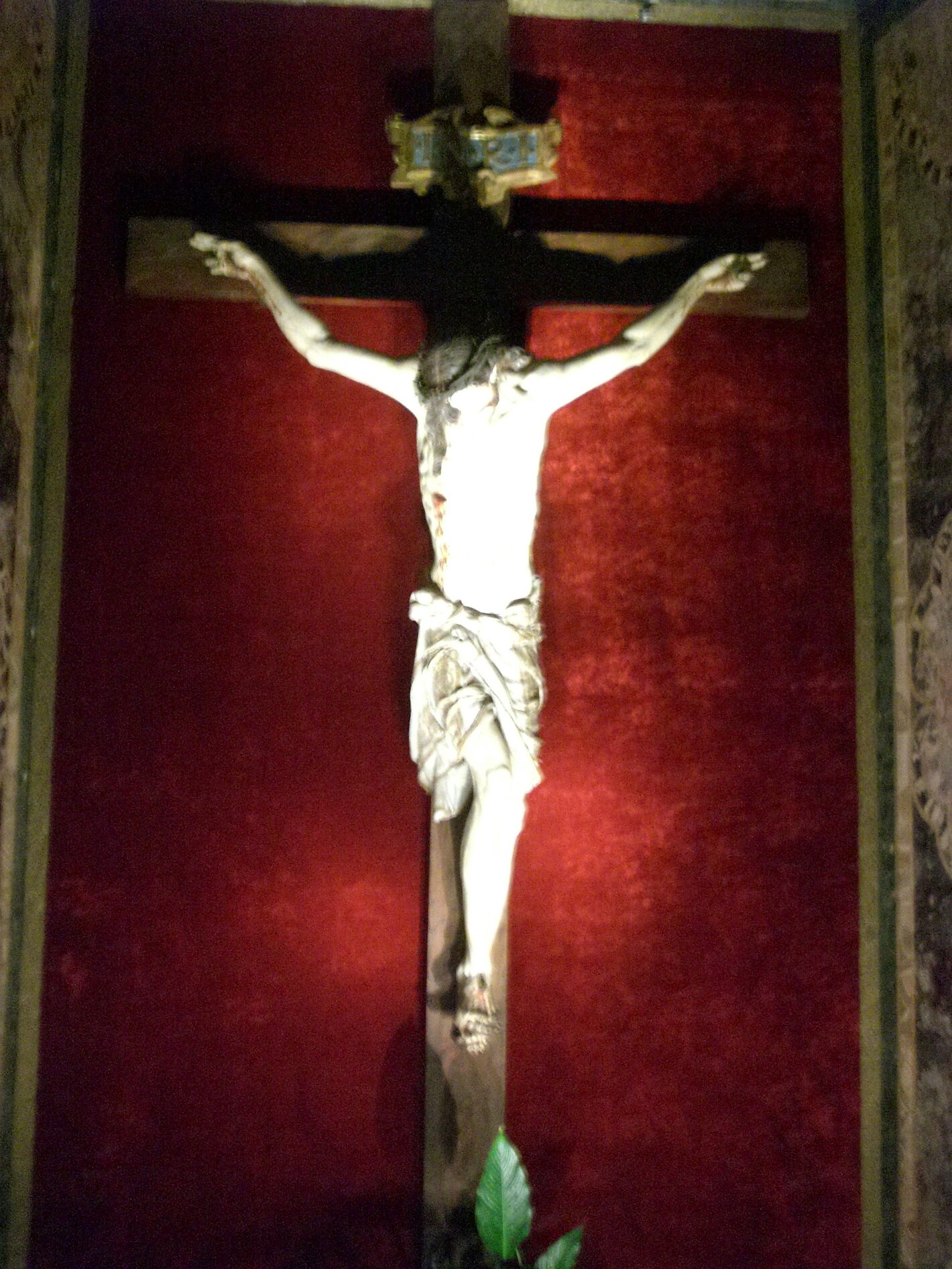This is a photo inside the Church of the Gesu, which is the Mother Church of the Jesuit Order and is located in Rome, Italy. This is the main crucifix in the Church.