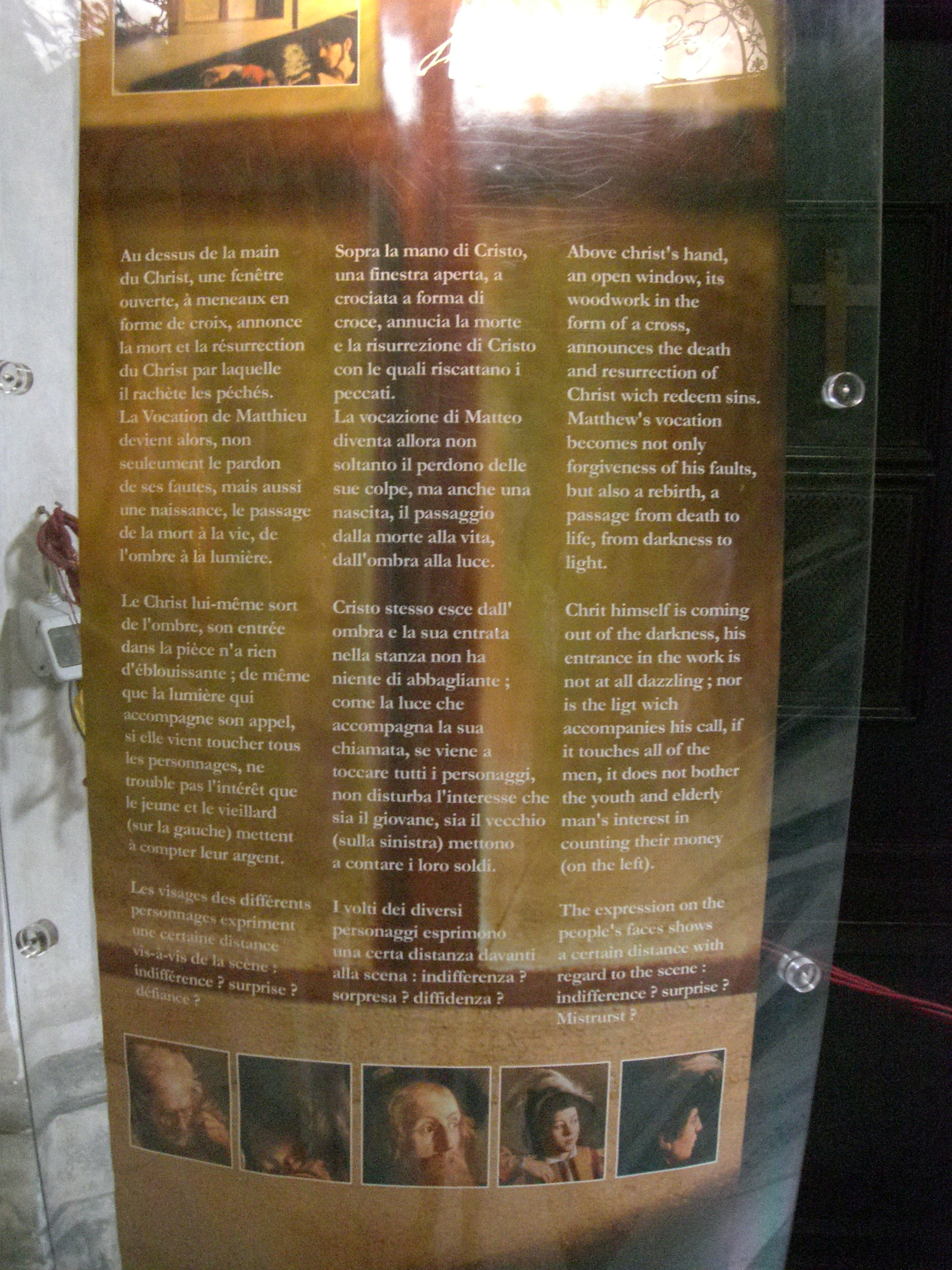 This is information on a famous painting, 'The Calling of Saint Matthew' (1599-1600) by Caravaggio, located in the Church of Saint Louis of the French, which is a minor basilica in Rome, Italy.