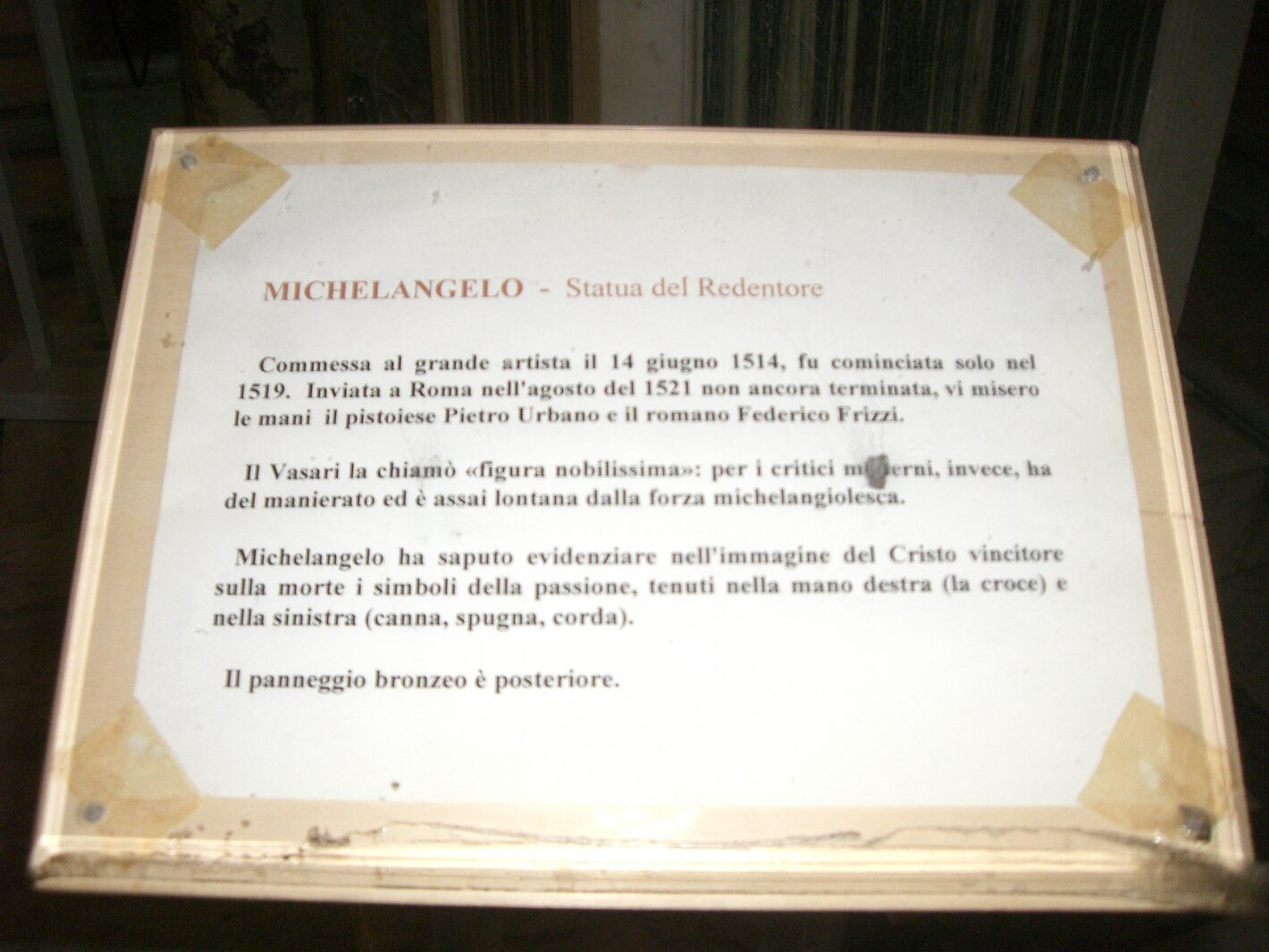 This work was commissioned in June 1514 by Metello Vari. The Cross, reed, sponge, and rope in Christ's hands highlight his victory over death through symbols of the Passion. It is to the left of the main altar at the Santa Maria sopra Minerva in Rome.