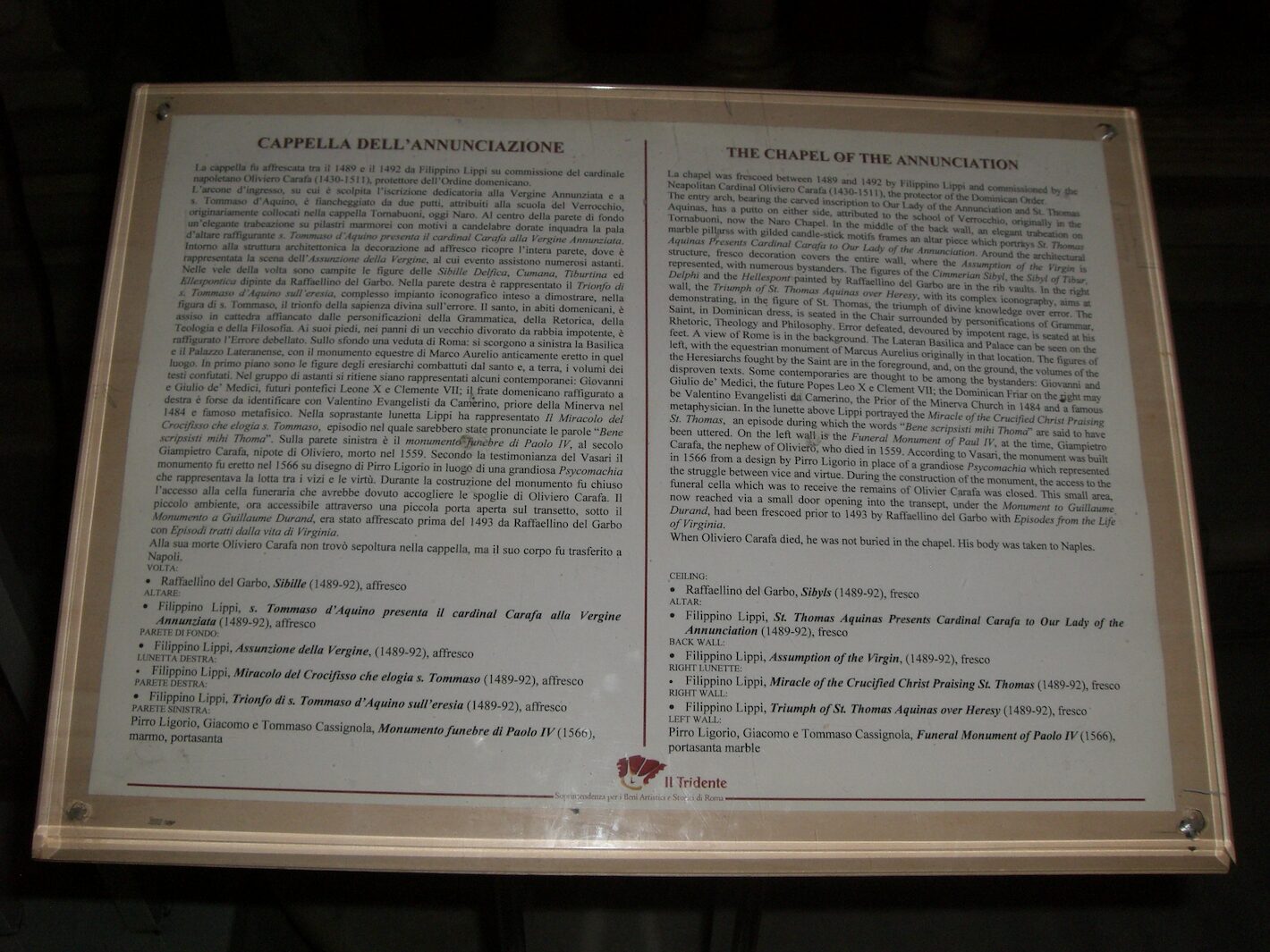 This basilica, located in Rome, was built on top of the ancient temple of a Greek goddess, and is named such. This is the considered the only Gothic-style church in Rome, and is famous for containing the tombs of St Catherine of Siena, Fra Angelico, and Galileo Galilei.This is an informational sign about the Chapel of the Annunciation.