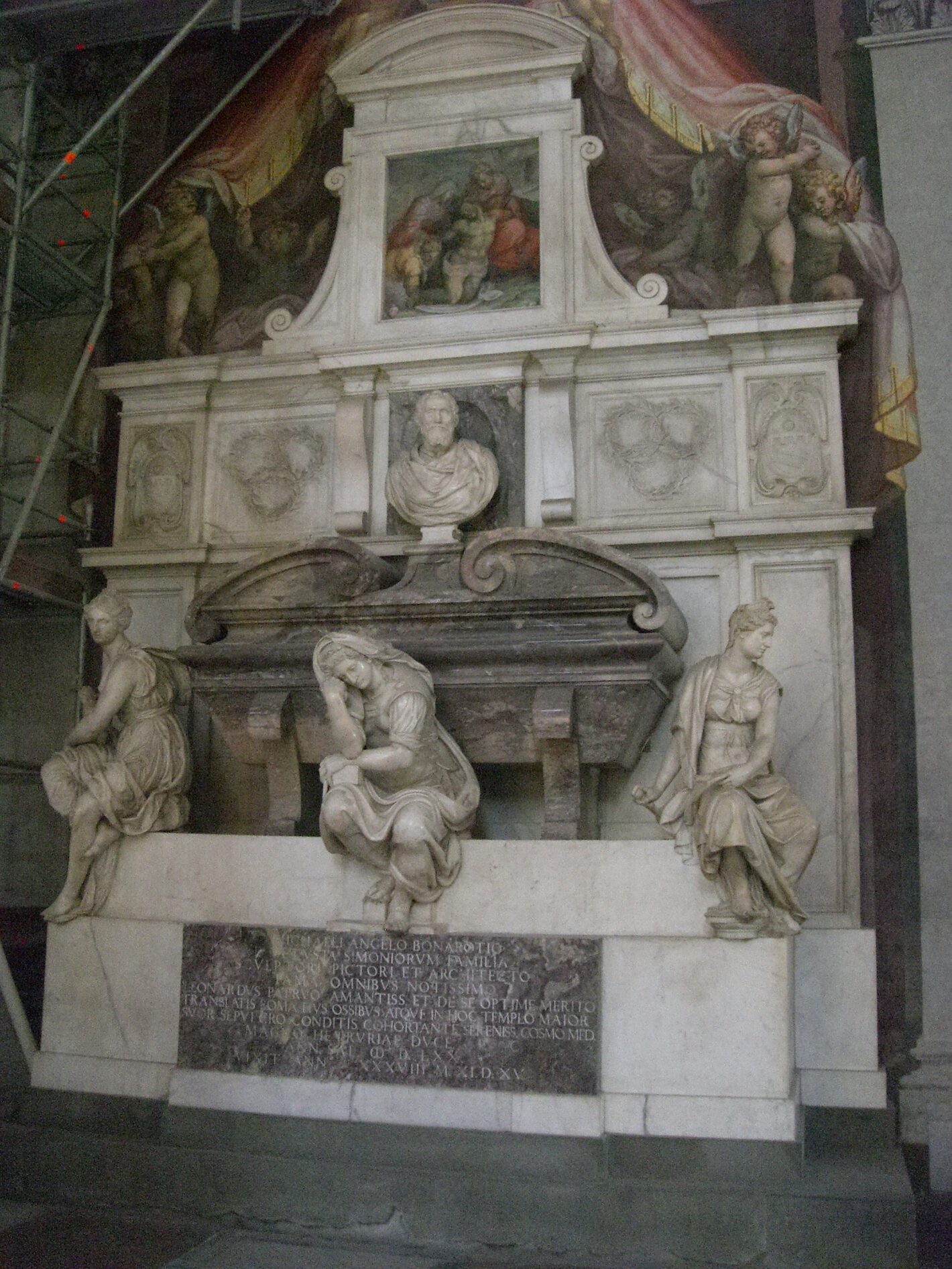 This is a photograph the tomb of Michelangelo inside the Basilica of San Croce in Florence, Italy.