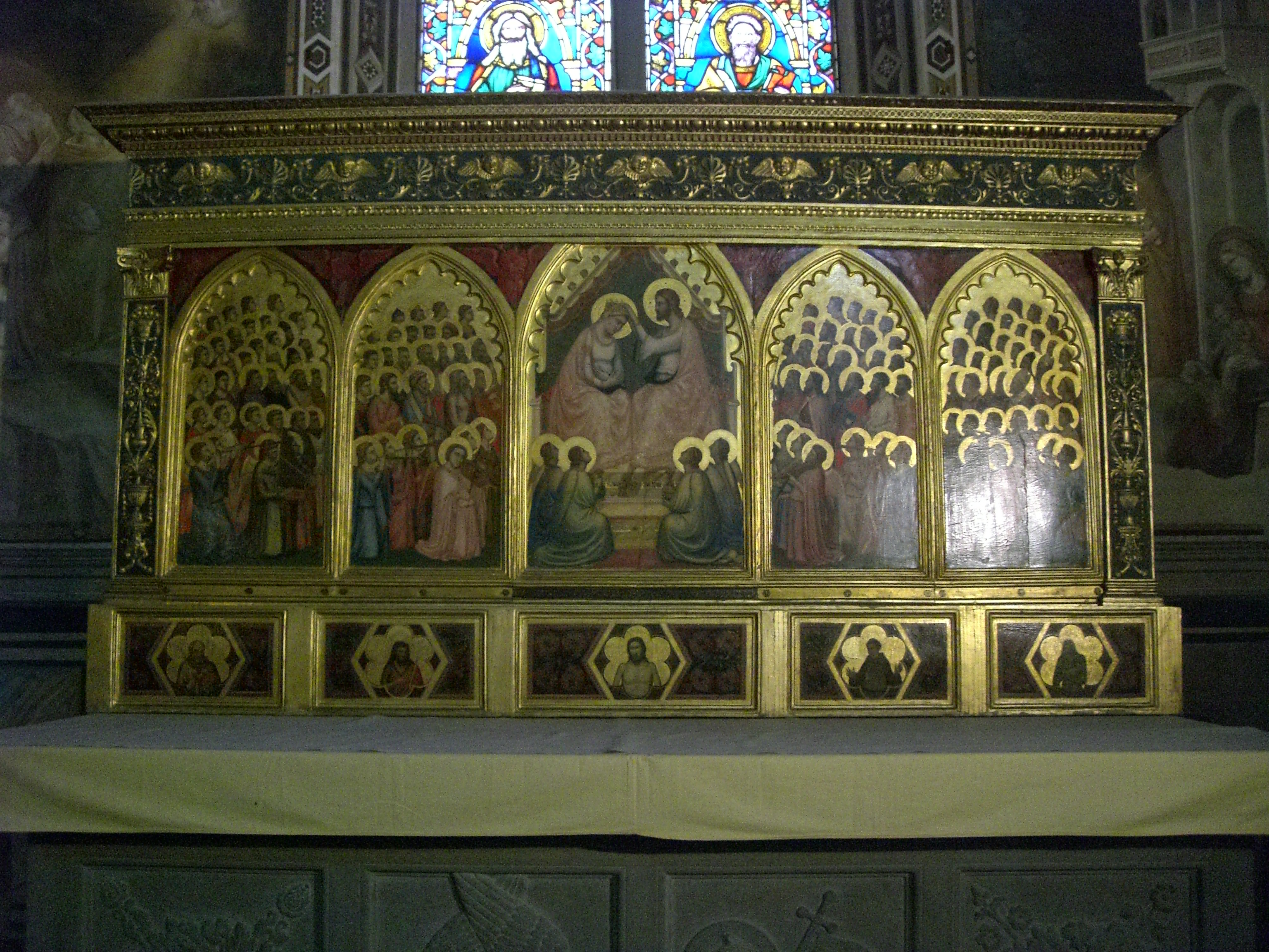 This is a photograph of an altar with artwork inside the Basilica of San Croce in Florence, Italy.