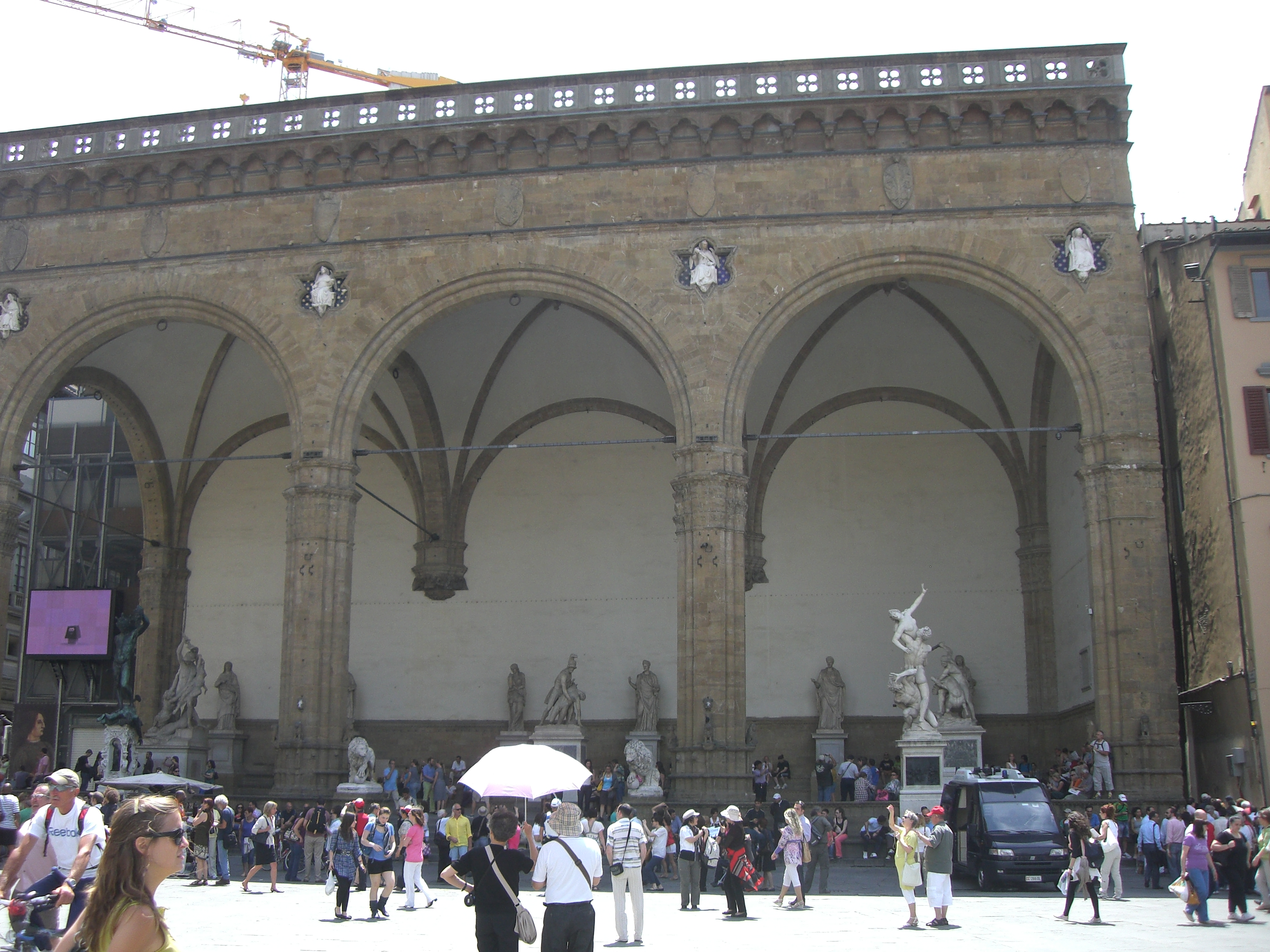 This is a photo of the Loggia dei Lanzi in Florence, Italy, where several famous statues are on display.