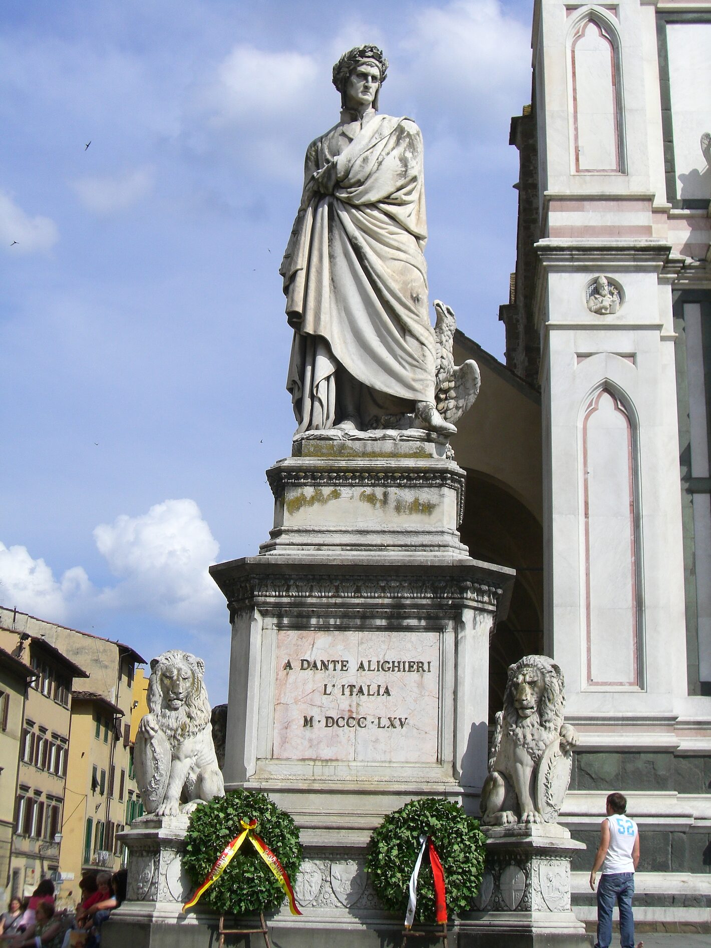This statue stands in the Piazza Santa Croce in Florence. This square takes its names from the Basilica of Santa Croce that overlooks the area; the Basilica holds Dante's empty tomb. The inscription reads, "To Dante Alighieri From Italy 1865."