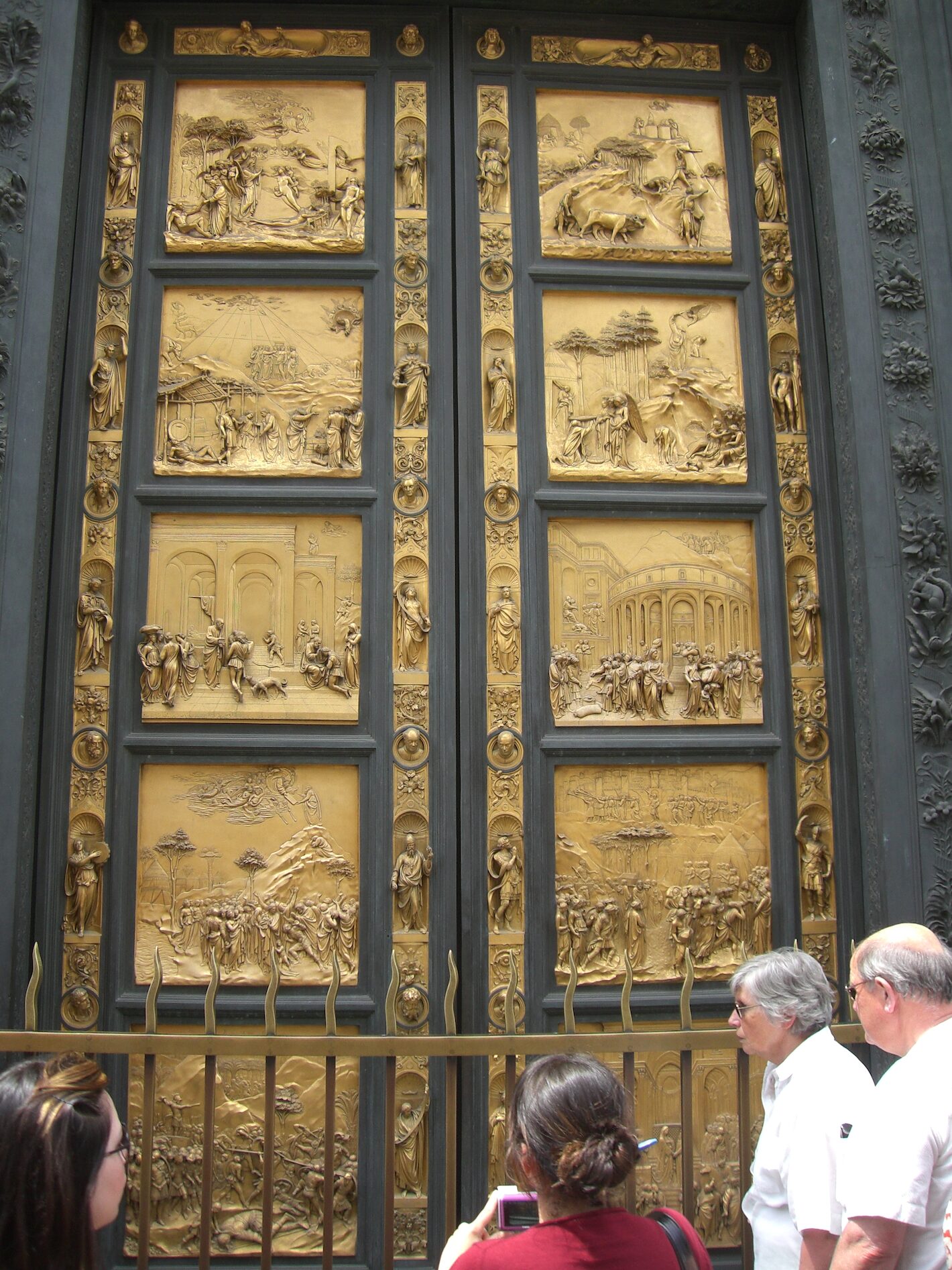 This is a photograph of the baptistry dor at the Florence Cathedral in the Piazza del Duomo in Italy.