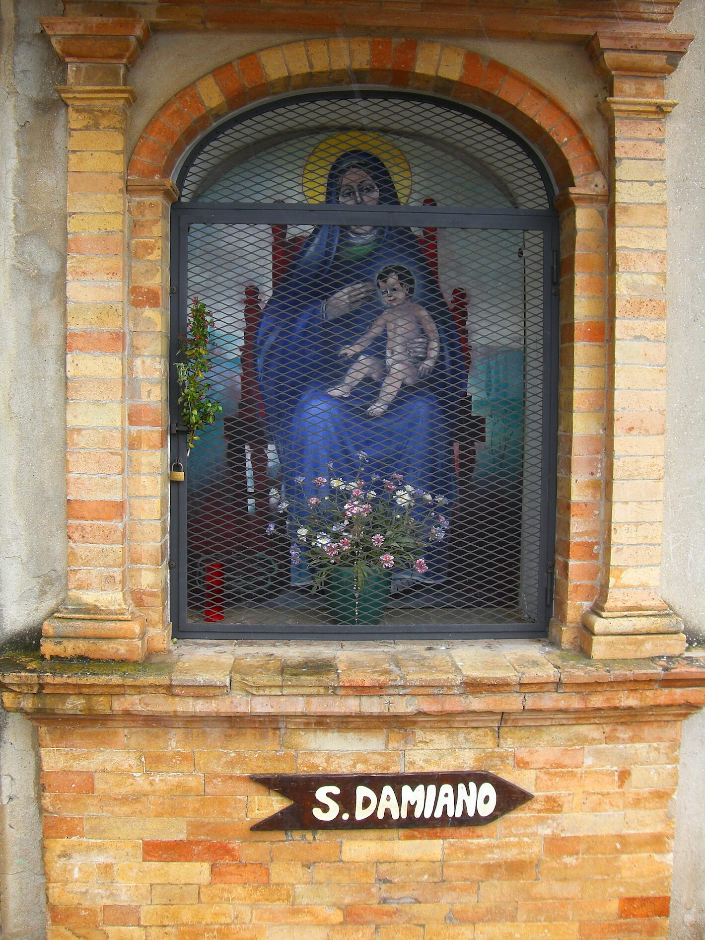 This is a photograph of an image of Mary and the Child Jesus along the road to the Church of San Damiano in Assisi, Italy.