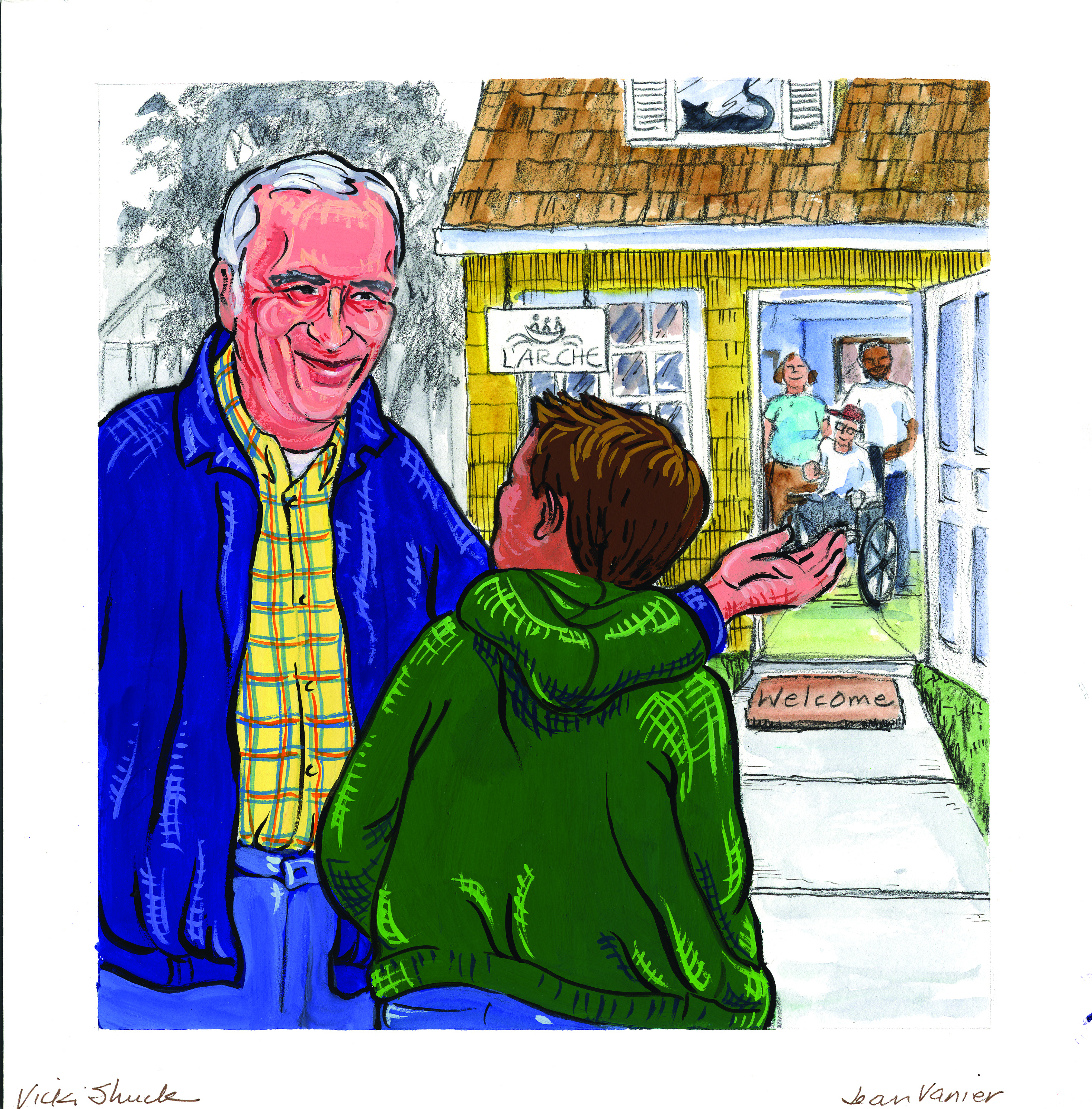 This is an illustration of Jean Vanier, a Catholic philosopher, humanitarian, and founder of L'Arche communities.