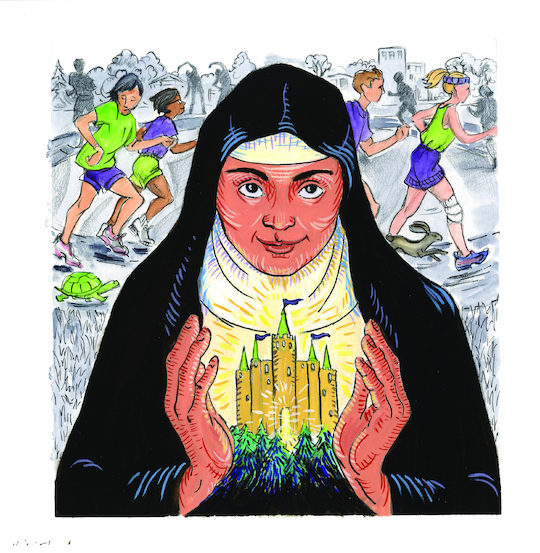 This is an illustration of Saint Teresa of Avila, who was a Carmelite nun, mystic, writer, and doctor of the Church.