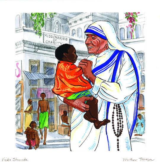 This is an illustration of Saint Teresa of Calcutta, who is a model of holiness in the Catholic Church.