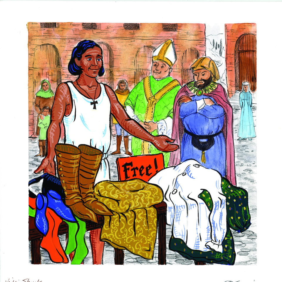 This is an illustration of Saint Francis of Assisi, who founded the Franciscan order and lived the call to chastity, poverty and obedience in a time of struggle for the Catholic Church.