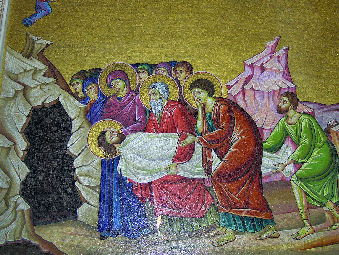 This is an image inside the Church of the Holy Sepulchar. It is one of the Stations of the Cross - Jesus' Body is Placed in the Tomb.
