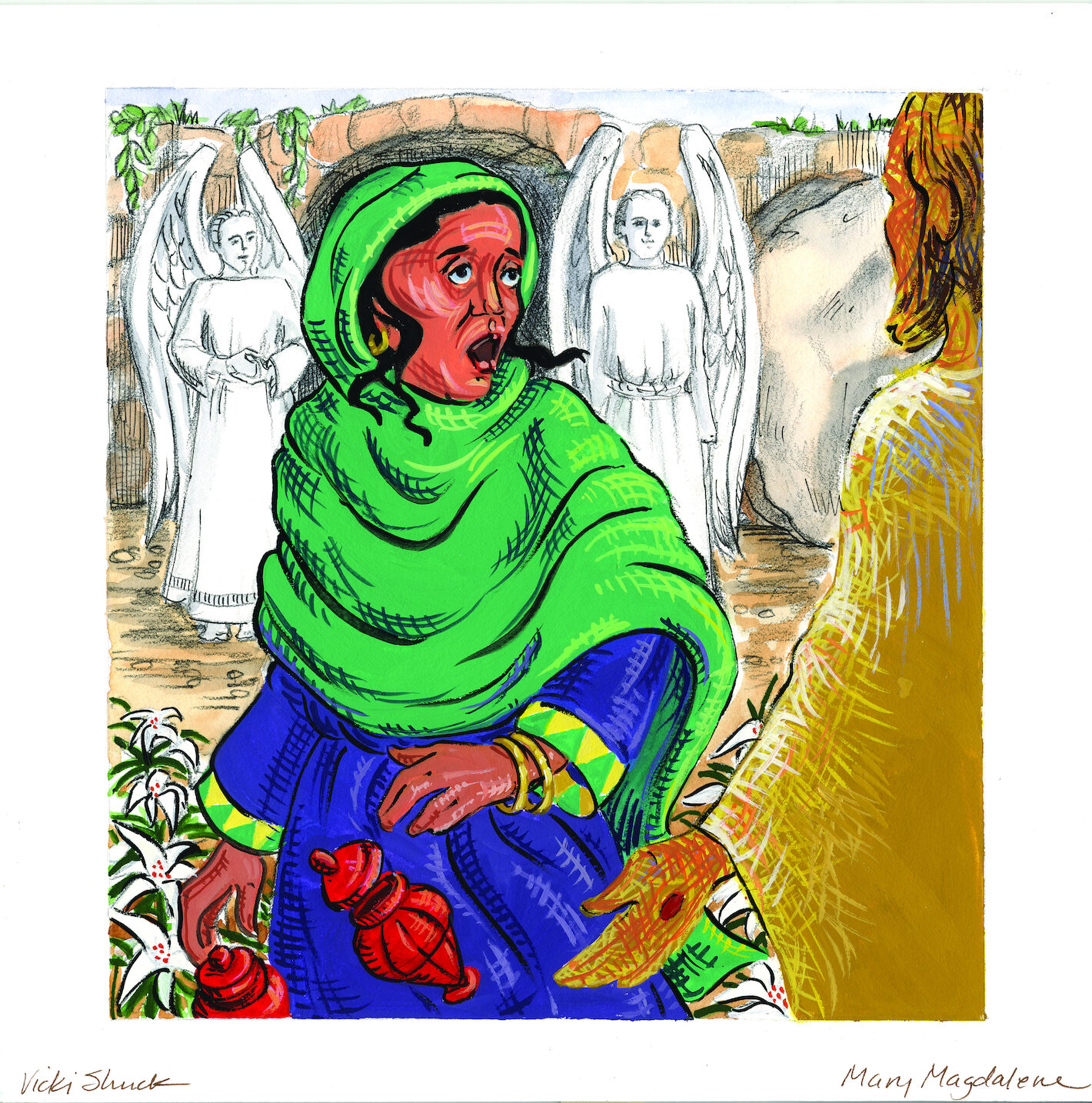 This is an illustration of St Mary Magdalene, who was the first of the disciples to witness Christ's resurrection.
