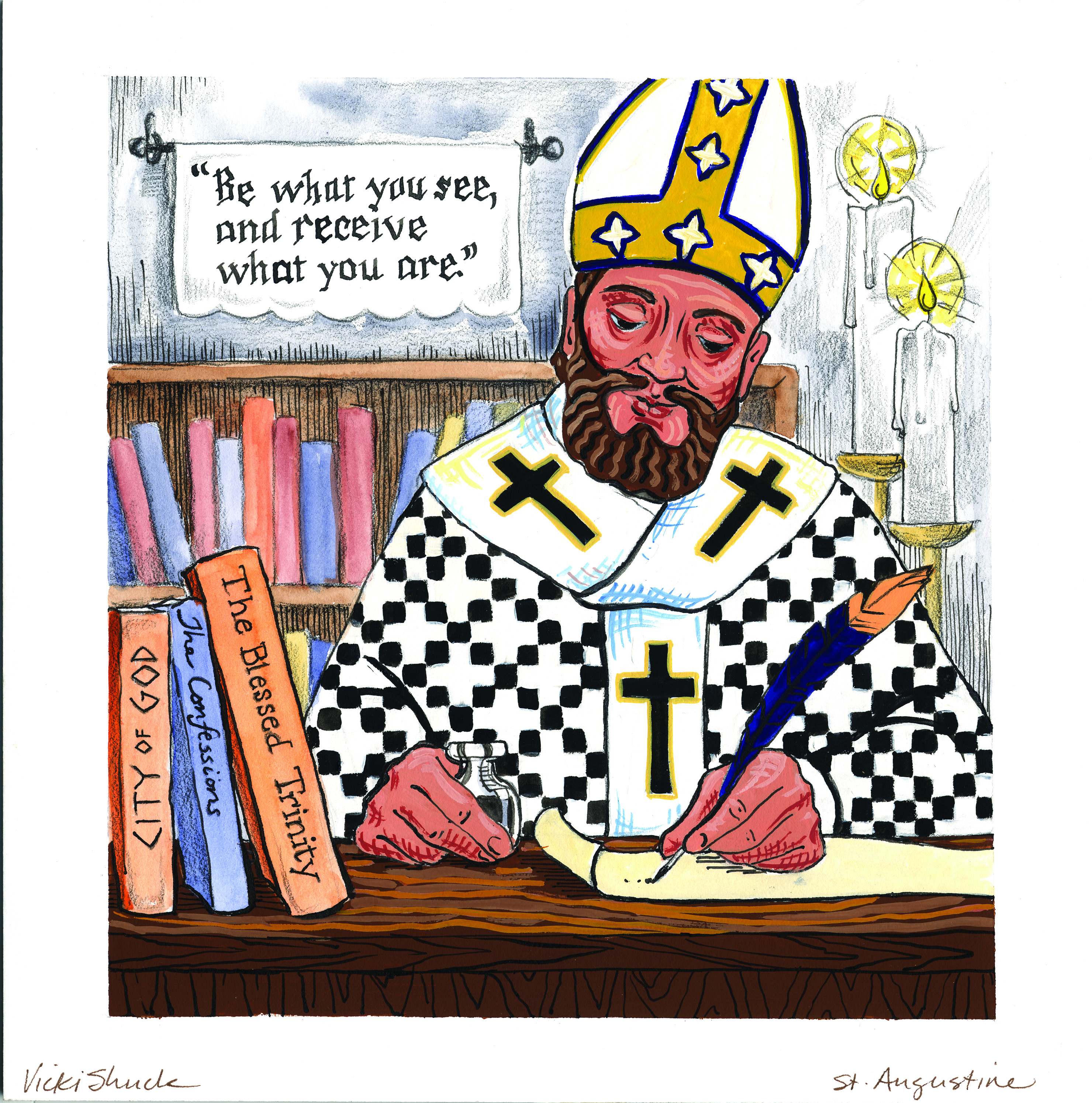 This is an illustration of St Augustine of Hippo, who was a famous theologian and bishop of the early Christian church.