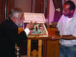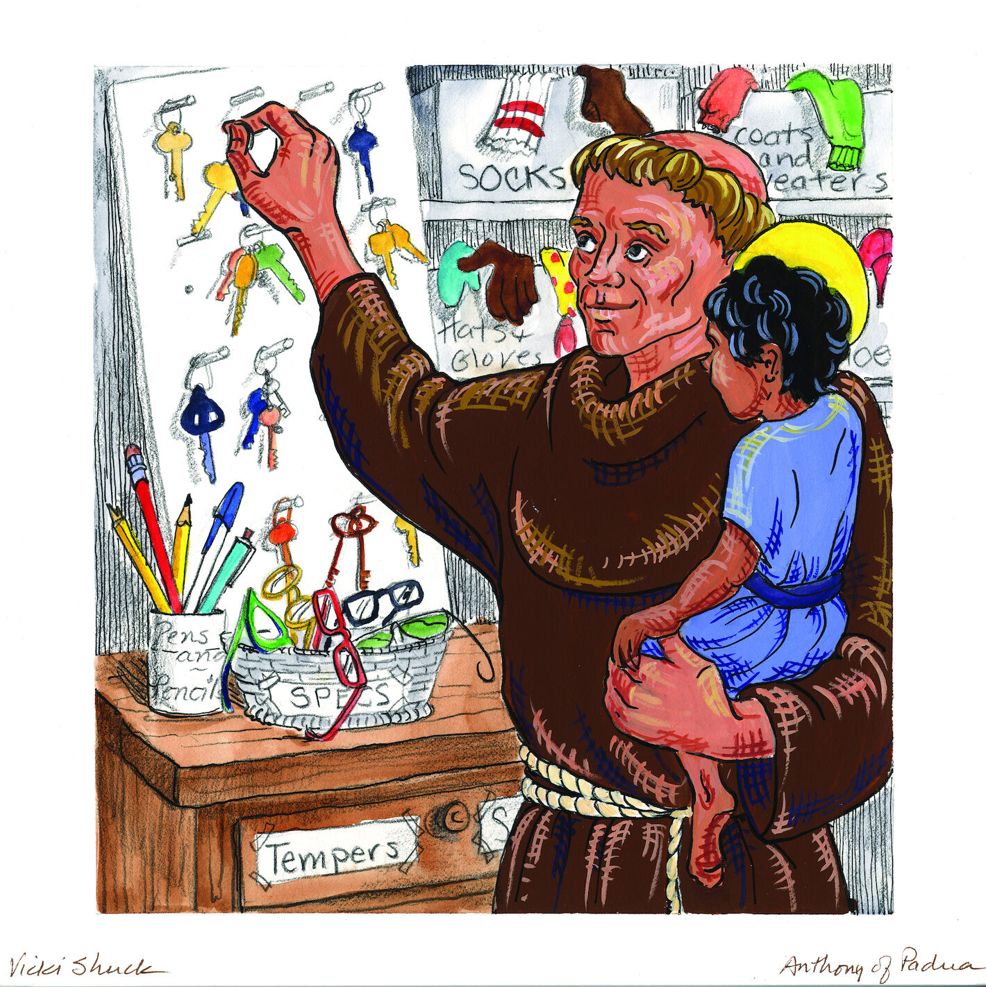 This is an illustration of Saint Anthony of Padua, who is holding the child Jesus. He is the patron saint of lost things.
