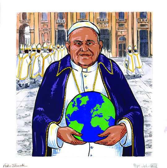 He was born Angelo Giuseppe Roncalli in Italy. Later he became known as "Good Pope John." During his lifetime, the world experienced two World Wars, the rise of communism, and the Holocaust. In the Church, there was fear of the modern world. Yet John XXIII embraced the world and called it "his parish." When he became pope at almost 77 years old, many thought he would be a transitional leader, making little change in the Church. Yet, in his five-year papacy, he revolutionized it. In 1962, he gathered all the bishops of the world in Rome. He also invited religious leaders, scholars, women, and even the news media. This gathering began four sessions called the Second Vatican Council. He wanted the Church to read the signs of the times and work for unity and peace within herself and with the entire modern world. He died after the first session. Yet what he began changed the way the Church prayed. It changed how it understood itself and the world. John XXIII paved the way for John Paul II, the ultimate "media pope," by being the first to welcome TV crews to the Vatican. He let the world see for the first time how the Church worked. Like John Paul II, he also had a sense of humor. When asked how many people worked in the Vatican, he said, "About half." John XXIII was beatified in 2000, and canonized in 2014. We celebrate his feast day on October 11, the day the Second Vatican Council began. (Taken from "The Catholic Connections Handbook for Middle Schoolers.")