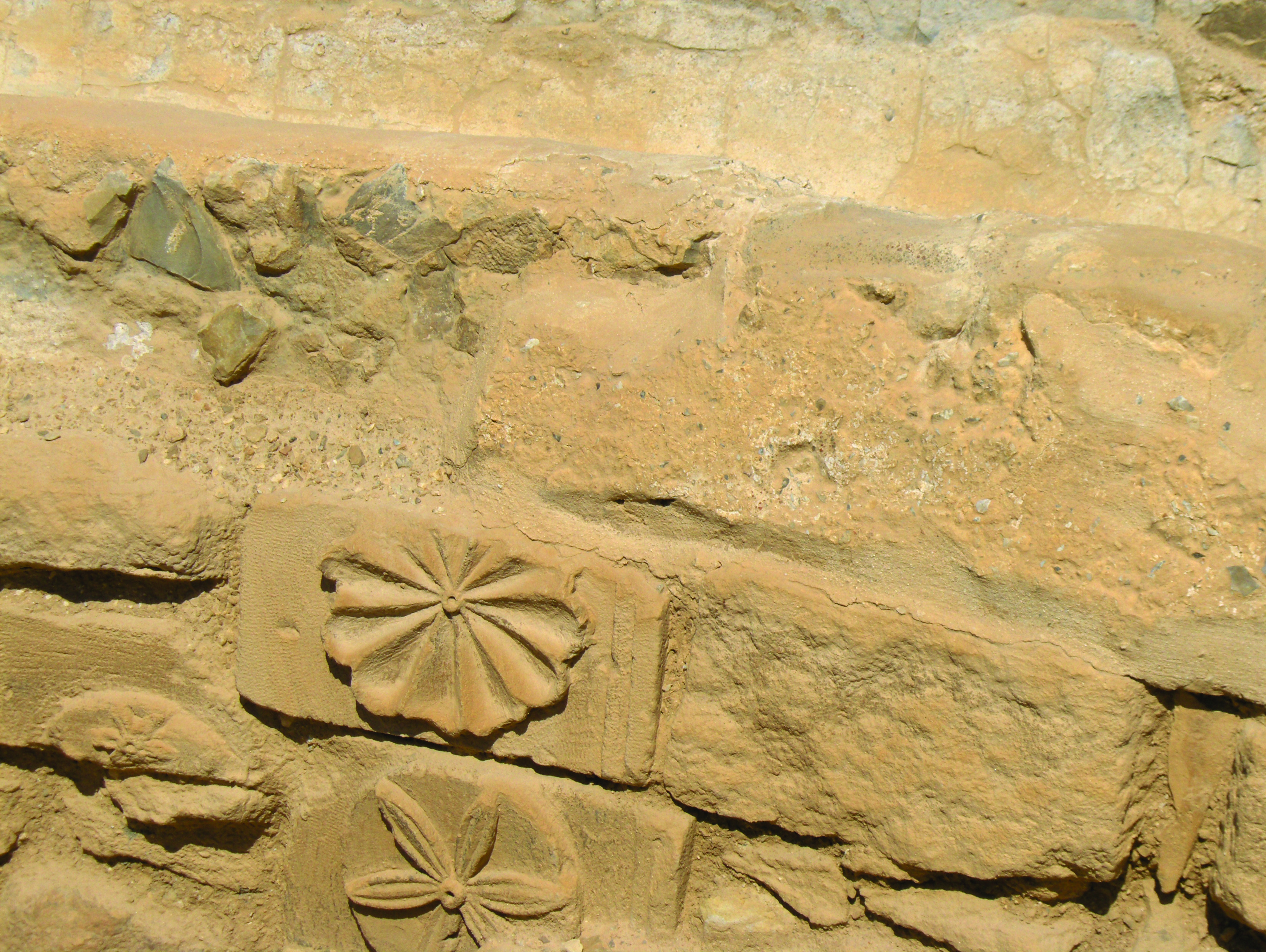Masada is the name of a site of ancient ruins of fortresses and palaces in the Southern District of Israel. This is a shell tile at Masada.