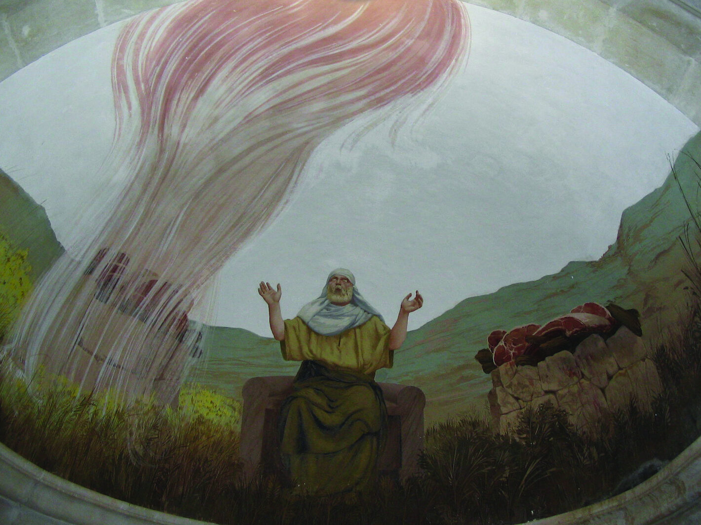 This is a photo inside the Church of the Transfiguration on Mount Tabor in Israel. The image is inside the Elijah Chapel, depicting Elijah's Challenge to Baal (1 Kings 18:16-45)