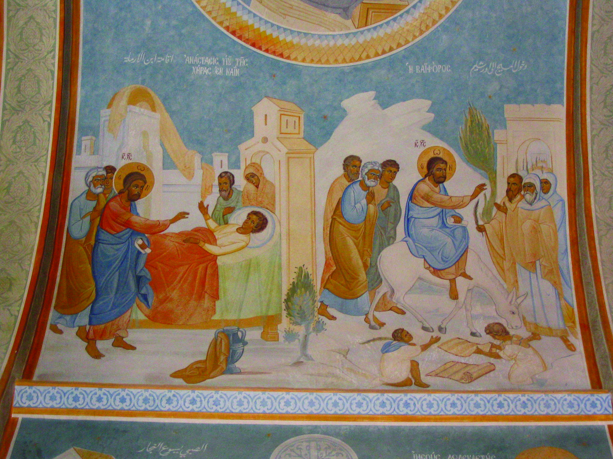 This is an icon in an Orthodox Church in Jerusalem. The left side depicts Jesus performing a healing miracle; the right side depicts Jesus’ triumphant entry into Jerusalem.
