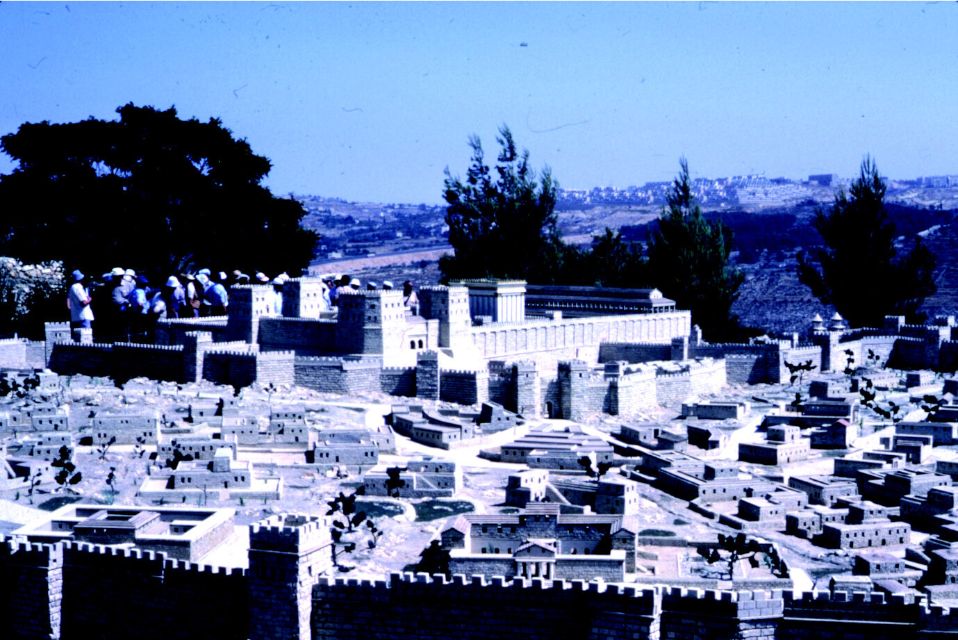 "This model shows the city of Jerusalem as it would have looked at the time of Jesus. The Roman Antonia Fortress, dominating the city in the center of the photograph, is the site of the praetorium where Pilate handed Jesus over to be crucified (John 18:28-19:16)."