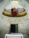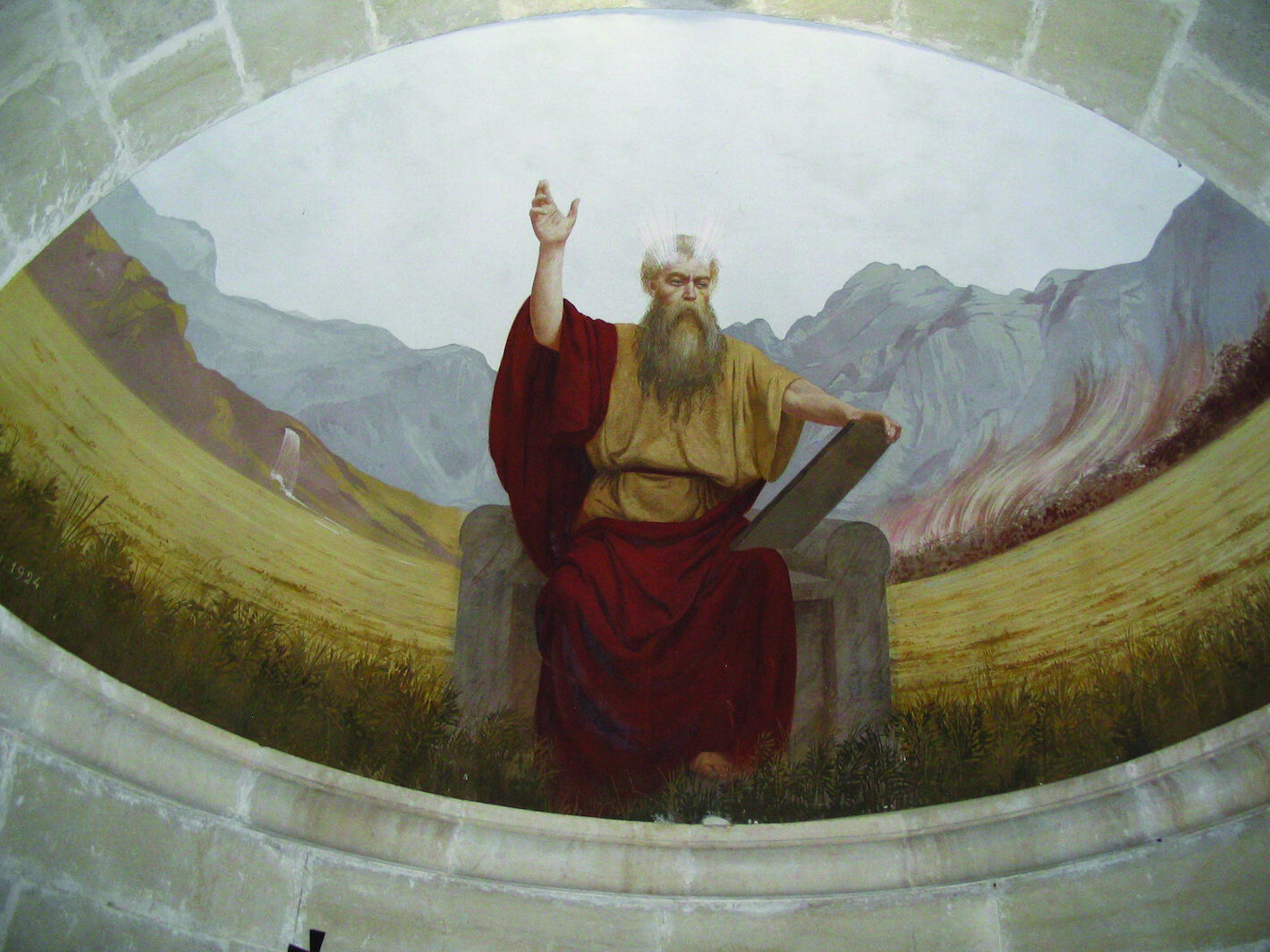 This is a photo inside the Church of the Transfiguration on Mount Tabor in Israel. The image is inside the Moses Chapel, depicting Moses with the 10 Commandments.
